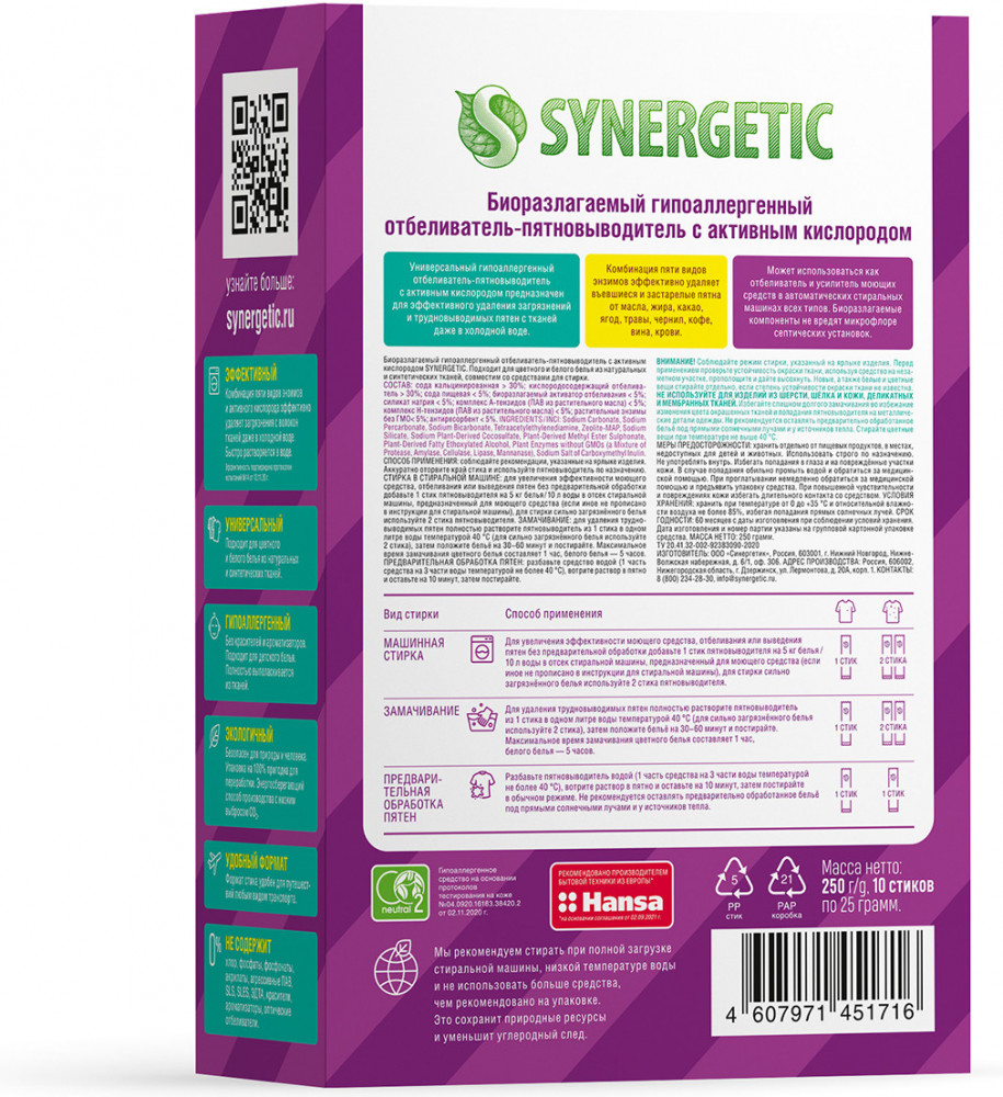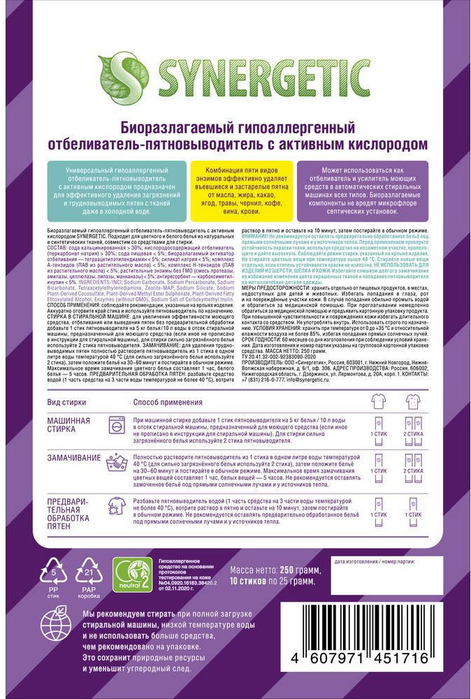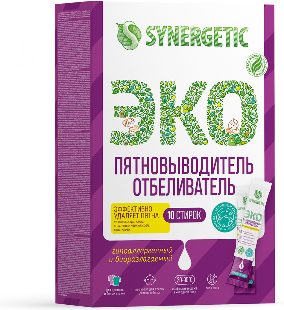 Synergetic Пятновыводитель-отбеливатель в стиках