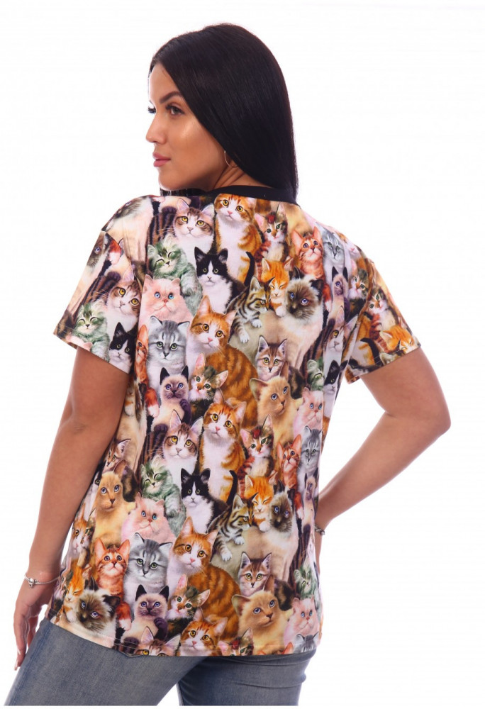 Принт у футболки прикольный, пошив вполне качественный, один минус - большемерит. Заказывала вместе с еще 2-мя футболками этого производителя, одна 44 р., но как 46, другая наоборот (46 как 44). С котами взяла 46, но она скорее как 48. В общем, размеры очень разнятся. Поэтому мне футболка оказалась большой. Придётся отдавать кому-то, либо носить, уповая на то, что сейчас мода на оверсайз) Еще стоит упомянуть, что горловина узкая, поэтому голова проходит не очень свободно и может остаться макияж на ткани. Строчки крупные, надеюсь при носке не начнут распускаться, т.к. мне кажется их легко зацепить.