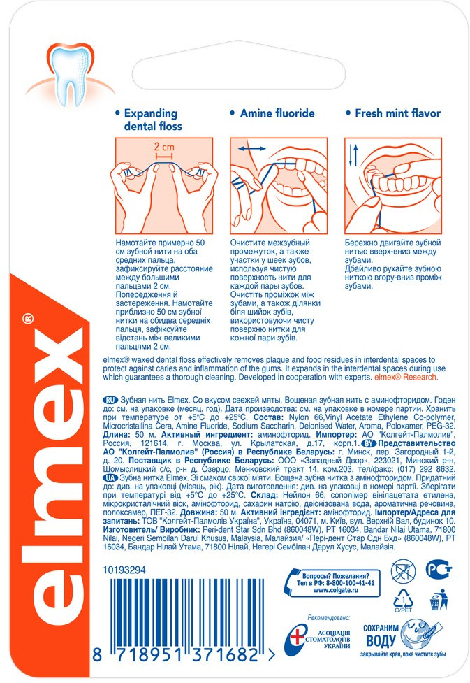 Elmex Нить зубная от кариеса со вкусом мятыВ данный момент этот товар отсутствует в продаже. Возможно, у нас найдется аналогичный или похожий товар здесь. Зубная нить «Elmex» со вкусом свежей мяты эффективно удаляет зубной налет и остатки пищи в межзубных промежутках, защищая от кариеса и воспаления десен. Содержит ингредиент аминофторид, который способствует профилактике развития кариеса. Зубная нить «Elmex» расширяется в межзубных промежутках во время использования, обеспечивая тщательную чистку. Зубная нить является важным дополнением к основному уходу за полостью рта. Длина 50 м. |