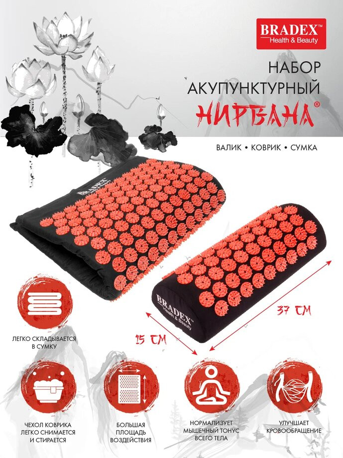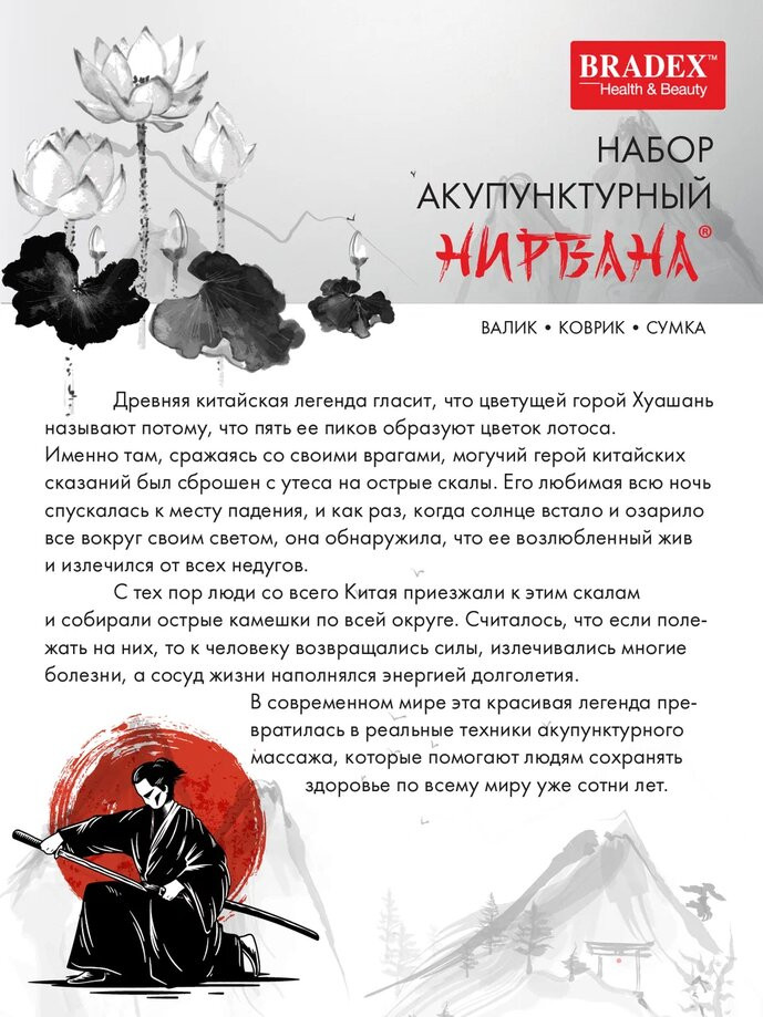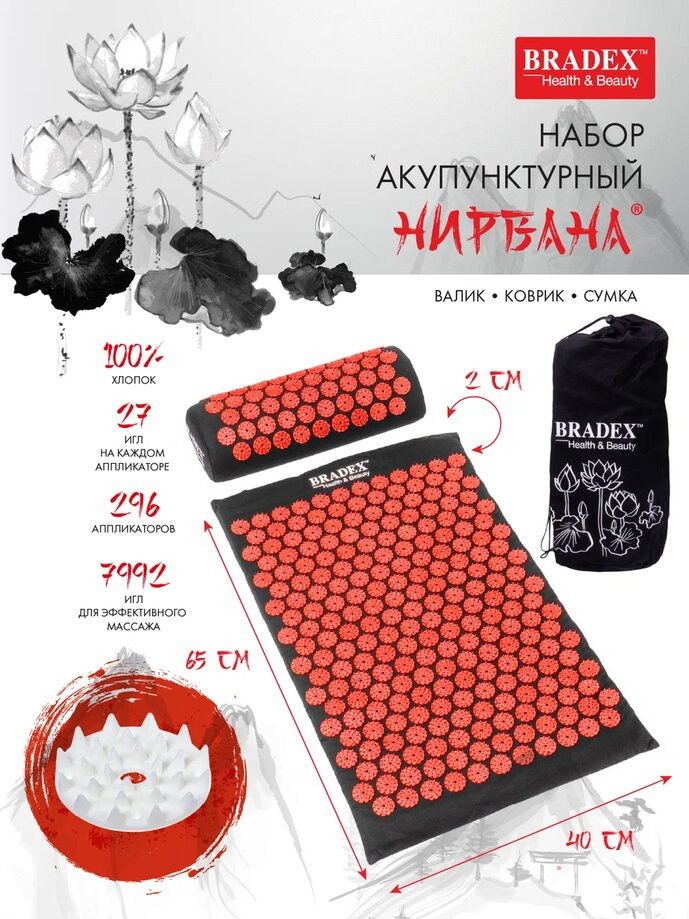 В основе серии товаров «Нирвана» лежит древнекитайский метод игольчатого массажа для воздействия на активные точки тела. Такой массаж способствует повышению мышечного тонуса, работоспособности и релаксации. Акупунктурный набор «Нирвана» включает в себя коврик, валик и сумку для хранения или переноски составляющих набора, чтобы всегда оставаться на страже своего здоровья как на тренировке, так и в путешествии. Острые акупунктурные шипы уникальной формы «Цветы жизни» стимулируют биологически активные точки и мышцы, снимают боль и усталость, улучшают работу опорно-двигательного аппарата и внутренних органов, помогают расслабиться и снять стресс после напряженного дня. Акупунктурный массаж помогает в профилактике целлюлита, стимулирует кровообращение, устраняет застойные явления в проблемных зонах, помогает выровнять кожный рельеф, повышает упругость и тонус кожи.