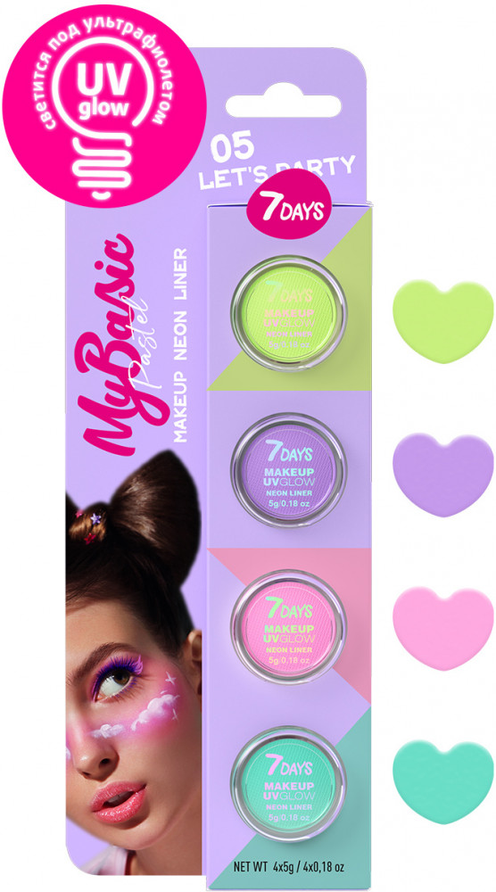 7Days Набор графических лайнеров для макияжаВ данный момент этот товар отсутствует в продаже. Возможно, у нас найдется аналогичный или похожий товар здесь. Вооружись кистью, вложенной в набор, размягчи сухой пигмент небольшим количеством воды и давай креативить! Цветная подводка для глаз быстро высыхает, обладает высокой стойкостью и светится под ультрафиолетом. В линейке представлена разнообразная пастельная палитра оттенков: нежно-сиреневый, бирюзовый, нежно-розовый, лаймовый. Подводка для стрелок и рисунков гарантировано обеспечит сияние на любом мероприятии. Создавай суперобразы для вечеринок, съемок, фотосессий или выступлений. Можно использовать как аквагрим. |