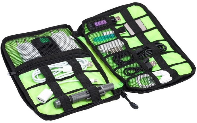 в общем бесполезная на мой взгляд вещь. слишком часто сделаны кармашки, влезает туда только шнуры без самой головки, их приходится класть в большой карман и места на пауэрбанки нет. ну если совсем мало всего, что требует размещения, тогда пойдет. но тогда и эта вещь не нужна. и слишком плотно приходится сворачивать провода, что совсем нехорошо для них.