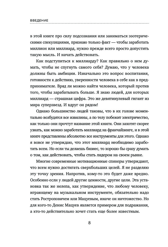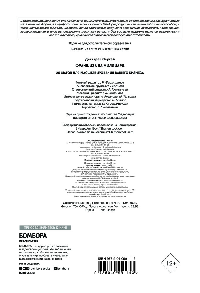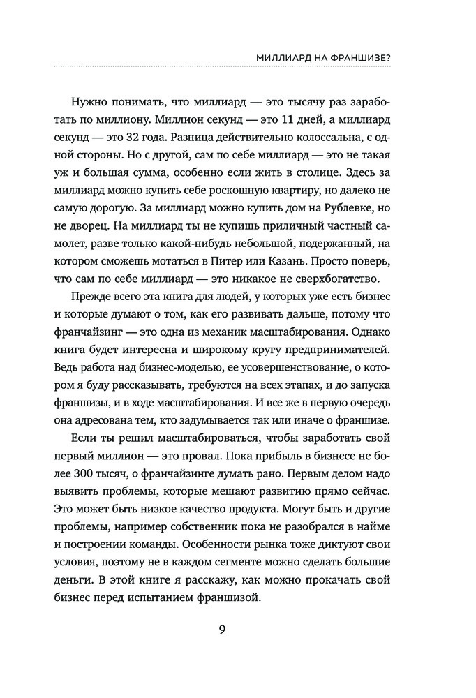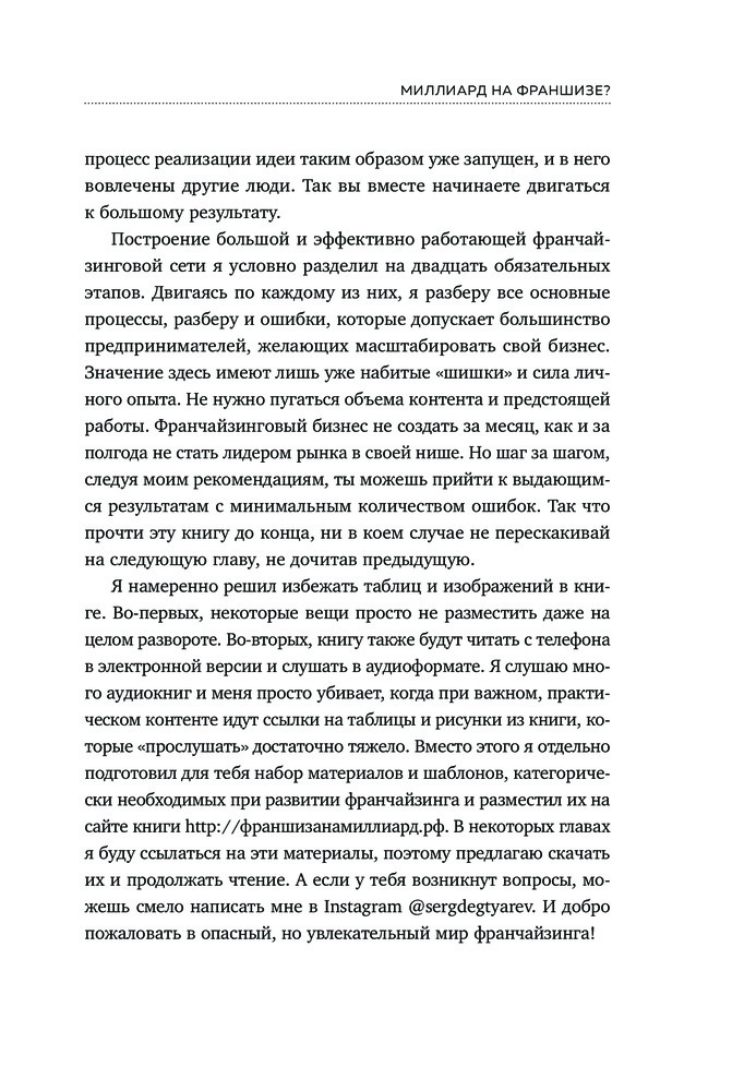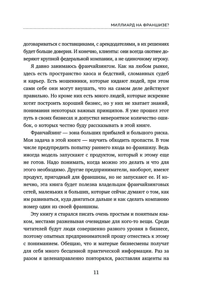 Франшиза на миллиард. 20 шагов для масштабирования вашего бизнесаВ данный момент этот товар отсутствует в продаже. Возможно, у нас найдется аналогичный или похожий товар здесь. Серия: Бизнес. Как это работает в России Задумываетесь о запуске франшизы или хотите масштабировать уже существующую франчайзинговую сеть? Сергей Дегтярев, эксперт № 1 по франчайзингу в России, дает инструкцию из 20 шагов, которая поможет вашему бизнесу кратно вырасти в течение одного года. Он проведет вас по всем этапам развития франшизы и на простых примерах объяснит, как подготовить бизнес к масштабированию, создать качественную франшизу и продавать ее на десятки миллионов в месяц, увеличить в несколько раз прибыль франчайзи и ежемесячные поступления в управляющую компанию. |