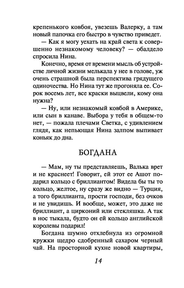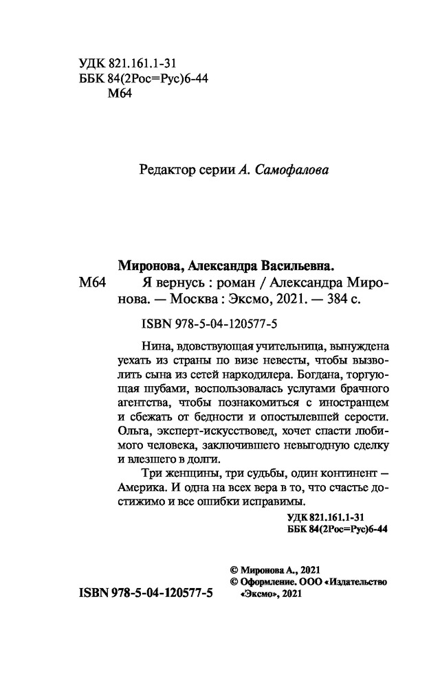 Я вернусьАлександра Васильевна Миронова В данный момент этот товар отсутствует в продаже. Возможно, у нас найдется аналогичный или похожий товар здесь. Серия: Уютный роман (обложка) Нина, вдовствующая учительница, вынуждена уехать из страны по визе невесты, чтобы вызволить сына из сетей наркодилера. Богдана, торгующая шубами, воспользовалась услугами брачного агентства, чтобы познакомиться с иностранцем и сбежать от бедности и опостылевшей серости. Ольга, эксперт-искусствовед, хочет спасти любимого человека, заключившего невыгодную сделку и влезшего в долги. |