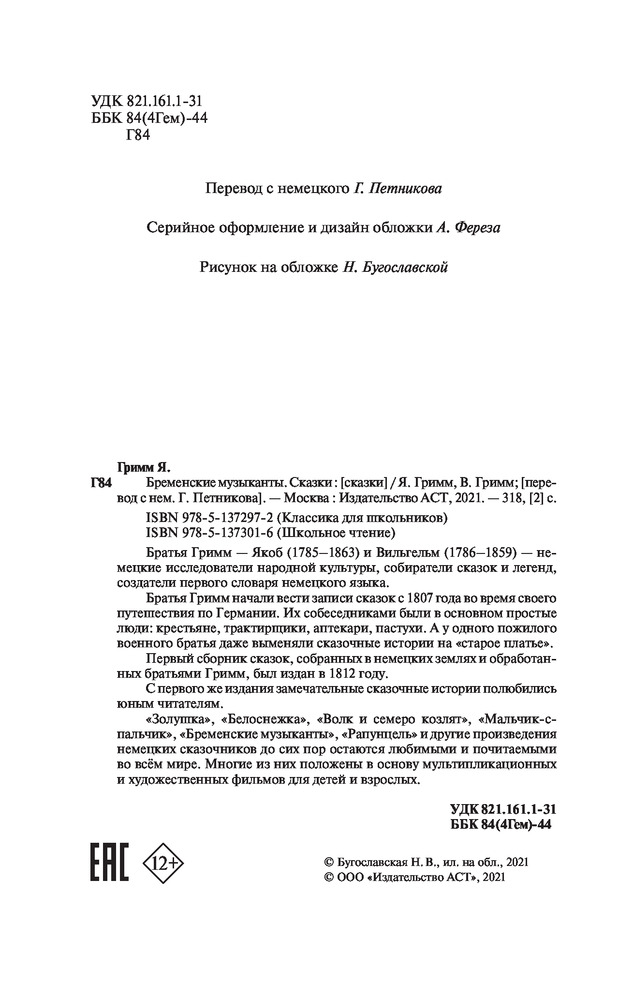 В данный момент этот товар отсутствует в продаже. Возможно, у нас найдется аналогичный или похожий товар здесь. Серия: Классика для школьников Братья Гримм — Якоб (1785–1863) и Вильгельм (1786–1859) — немецкие исследователи народной культуры, собиратели сказок и легенд, создатели первого словаря немецкого языка.