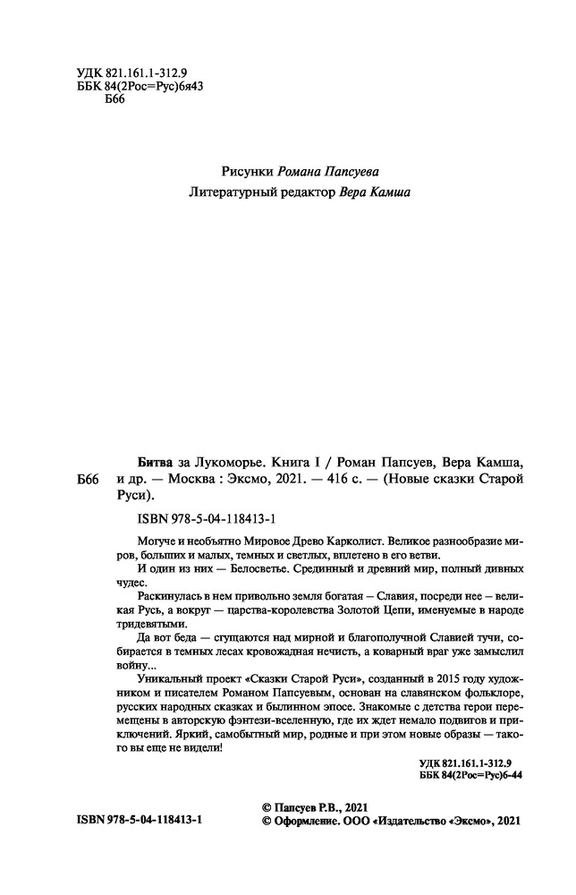 Битва за Лукоморье. Книга 1Роман Валентинович Папсуев, Вера Викторовна Камша В данный момент этот товар отсутствует в продаже. Возможно, у нас найдется аналогичный или похожий товар здесь. Серия: Новые сказки Старой Руси Проект Романа Папсуева «Сказки Старой Руси», в рамках которого он на современный лад переосмысляет персонажей сказок, сначала завоевал популярность в сети, затем получил развитие в артбуках и сувенирах, а теперь вышла первая художественная книга по миру Белосветья. В нее вошли 7 крупных историй и 6 — малых. Все крупные сказки получили титульные черно-белые иллюстрации, нарисованные самим Романом. Вместе с ним над книгой работала Вера Камша. |