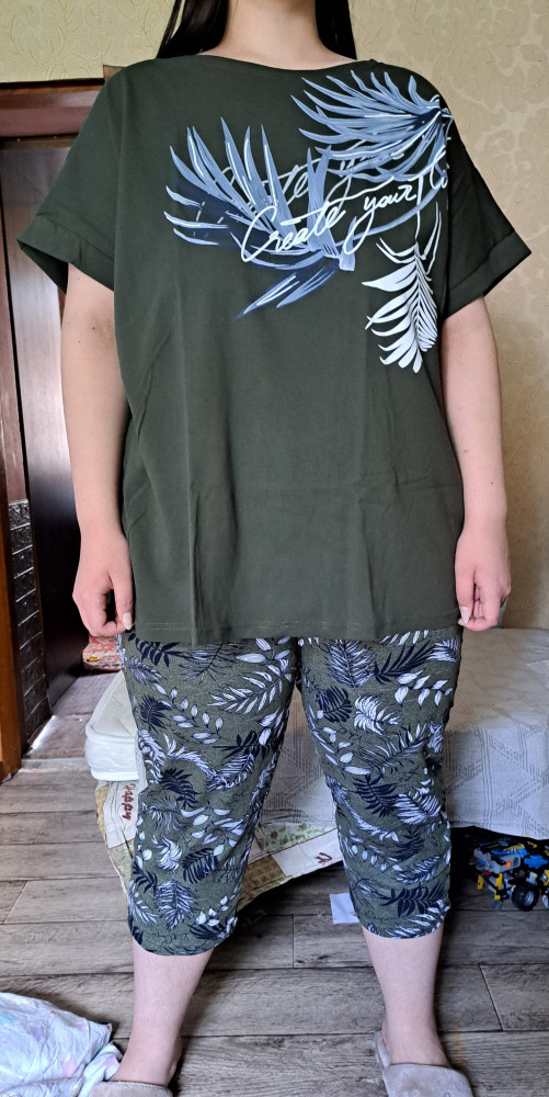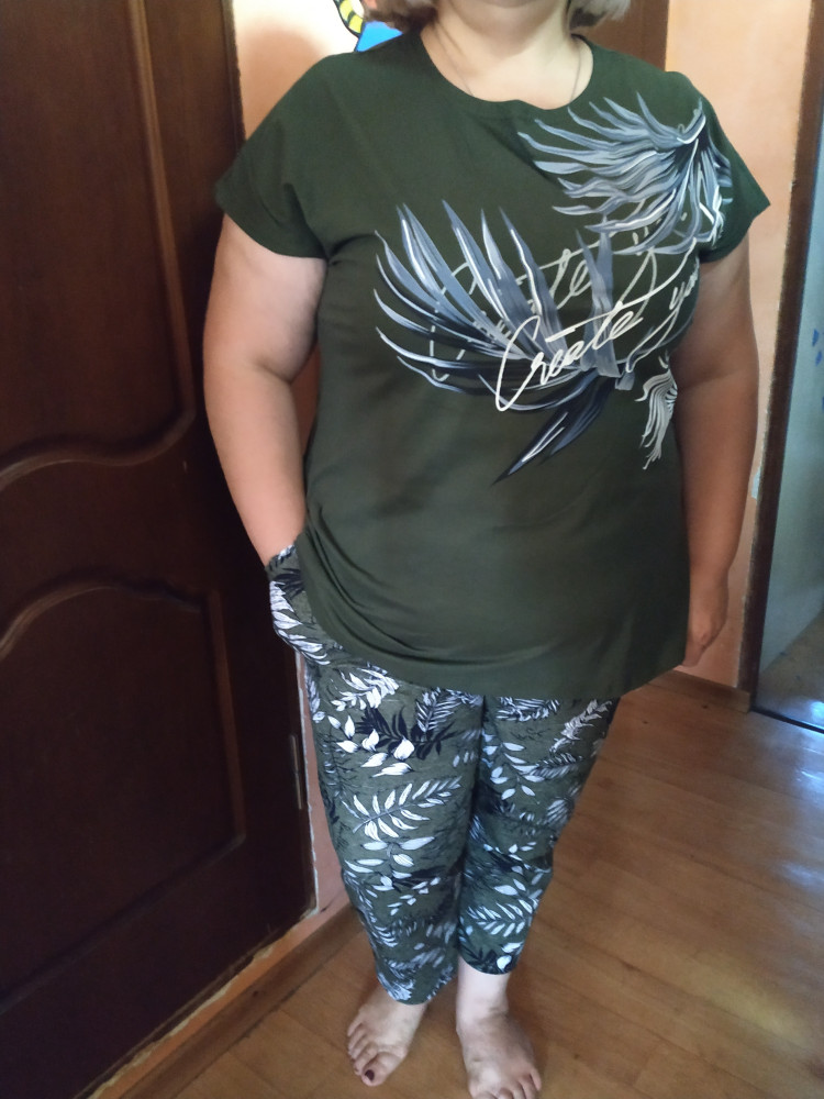 Очень милый комплект. Ткань приятная, расцветка классная, футболка приталенная. Всё устроило. Рекомендую.