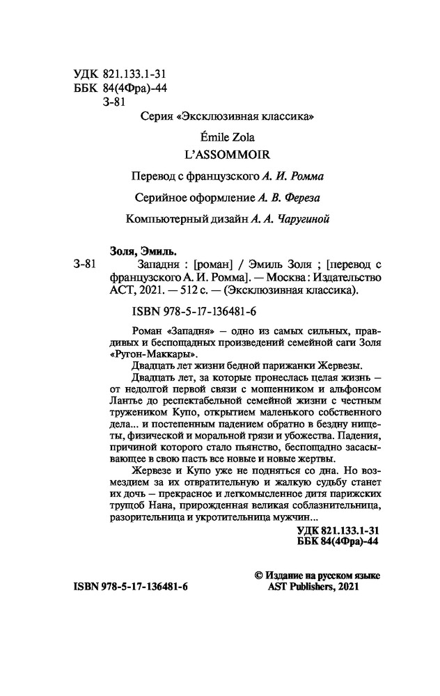 💳 Оплатить за товар можно при получении 🇰🇿 Есть бесплатная доставка по Казахстану от 1 дня 🎁 Копите бонусы с каждой покупки Серия: Эксклюзивная классика Роман «Западня» — одно из самых сильных, правдивых и беспощадных произведений семейной саги Золя «Ругон-Маккары». |