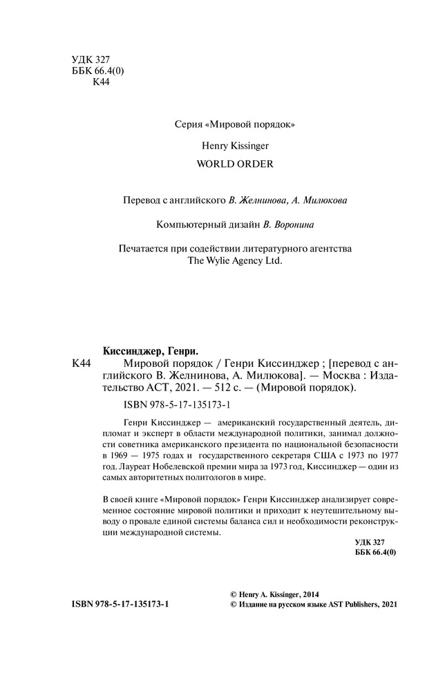 💳 Оплатить за товар можно при получении 🇰🇿 Есть бесплатная доставка по Казахстану от 1 дня 🎁 Копите бонусы с каждой покупки Серия: Мировой порядок Генри Киссинджер — американский государственный деятель, дипломат и эксперт в области международной политики, занимал должности советника американского президента по национальной безопасности в 1969 — 1975 годах и государственного секретаря США с 1973 по 1977 год. Лауреат Нобелевской премии мира за 1973 год, Киссинджер — один из самых авторитетных политологов в мире. |