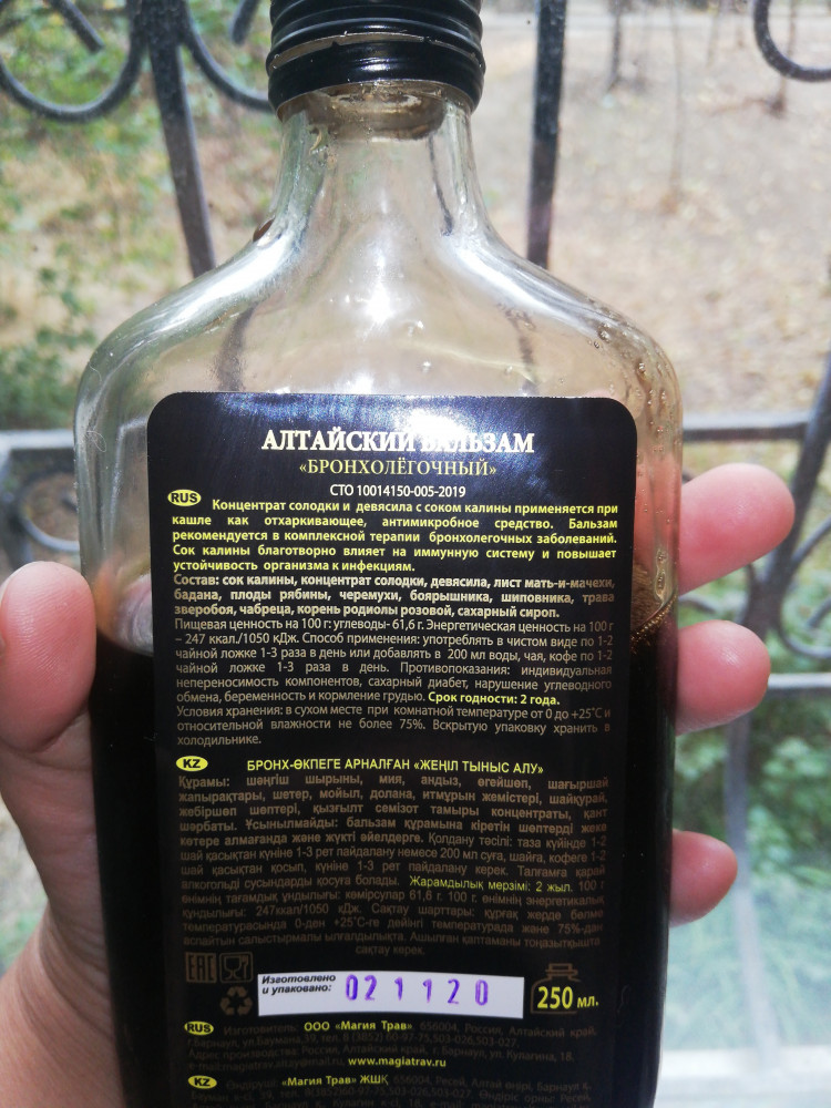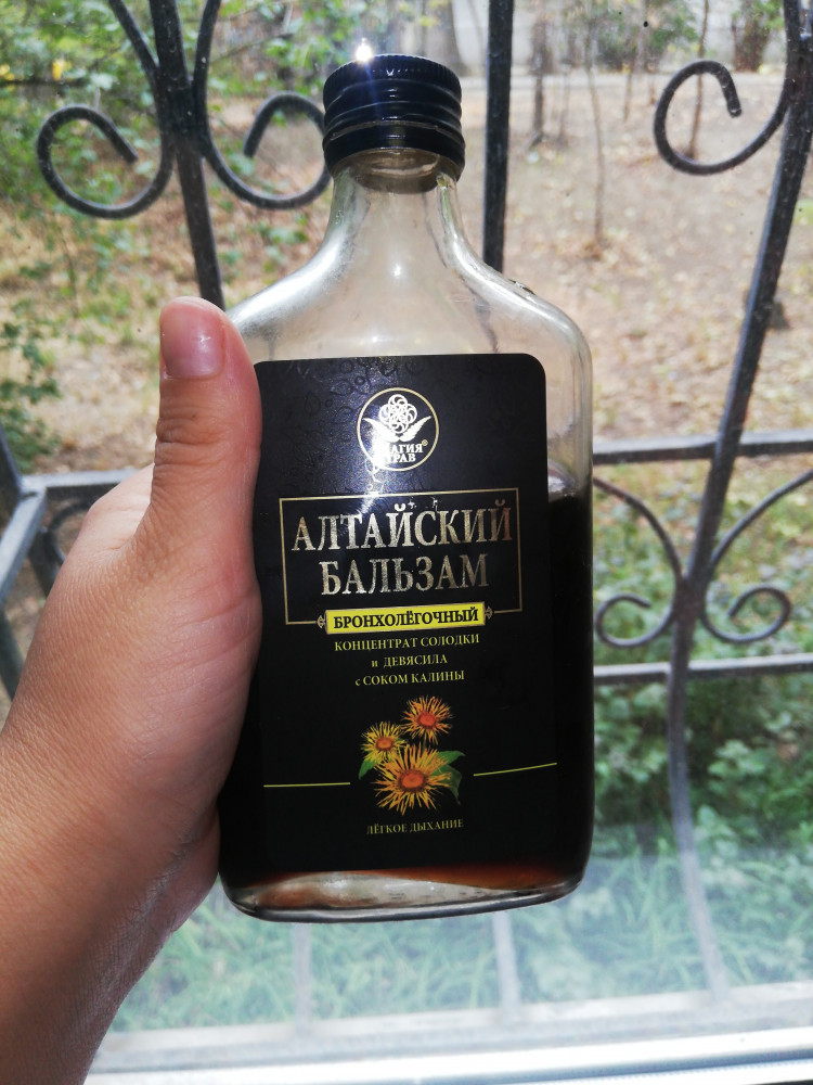 Брала бронхолегочный бальзам. Бутылочка стеклянная, крышечка металлическая. Упакован в солидную черную коробку. Выглядит очень красиво! Сироп сладкий, ощущается специфический аромат трав. Не могу сказать что на все 100 момогает от бронхита. Кашель облегчает, но не значительно. Из минусов, слишком много сахара. Разбавляла в кипятке, пила 2 раза в день. Поставлю 5 за красоту.