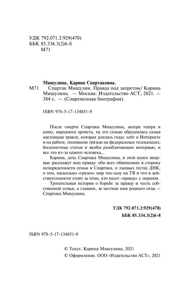 Спартак Мишулин. Правда под запретомВ данный момент этот товар отсутствует в продаже. Возможно, у нас найдется аналогичный или похожий товар здесь. Серия: Современная биография После смерти Спартака Мишулина, актера театра и кино, народного артиста, на его семью обрушилась самая настоящая травля, которая длилась годы: хейт в интернете и на работе, поливание грязью на федеральных телеканалах, бесконечные статьи и якобы разоблачающие интервью, и все это из-за одного человека... |