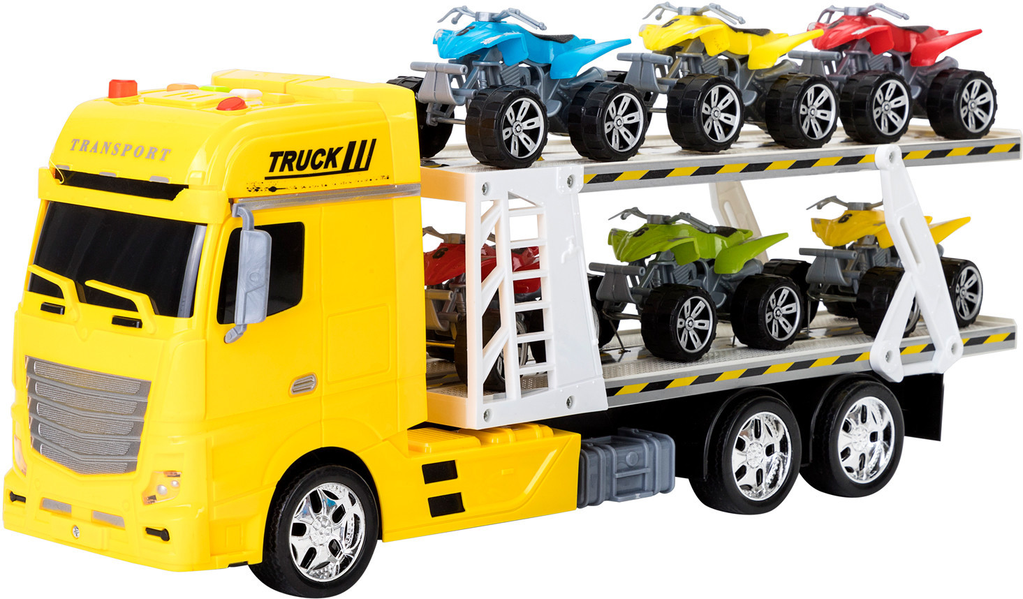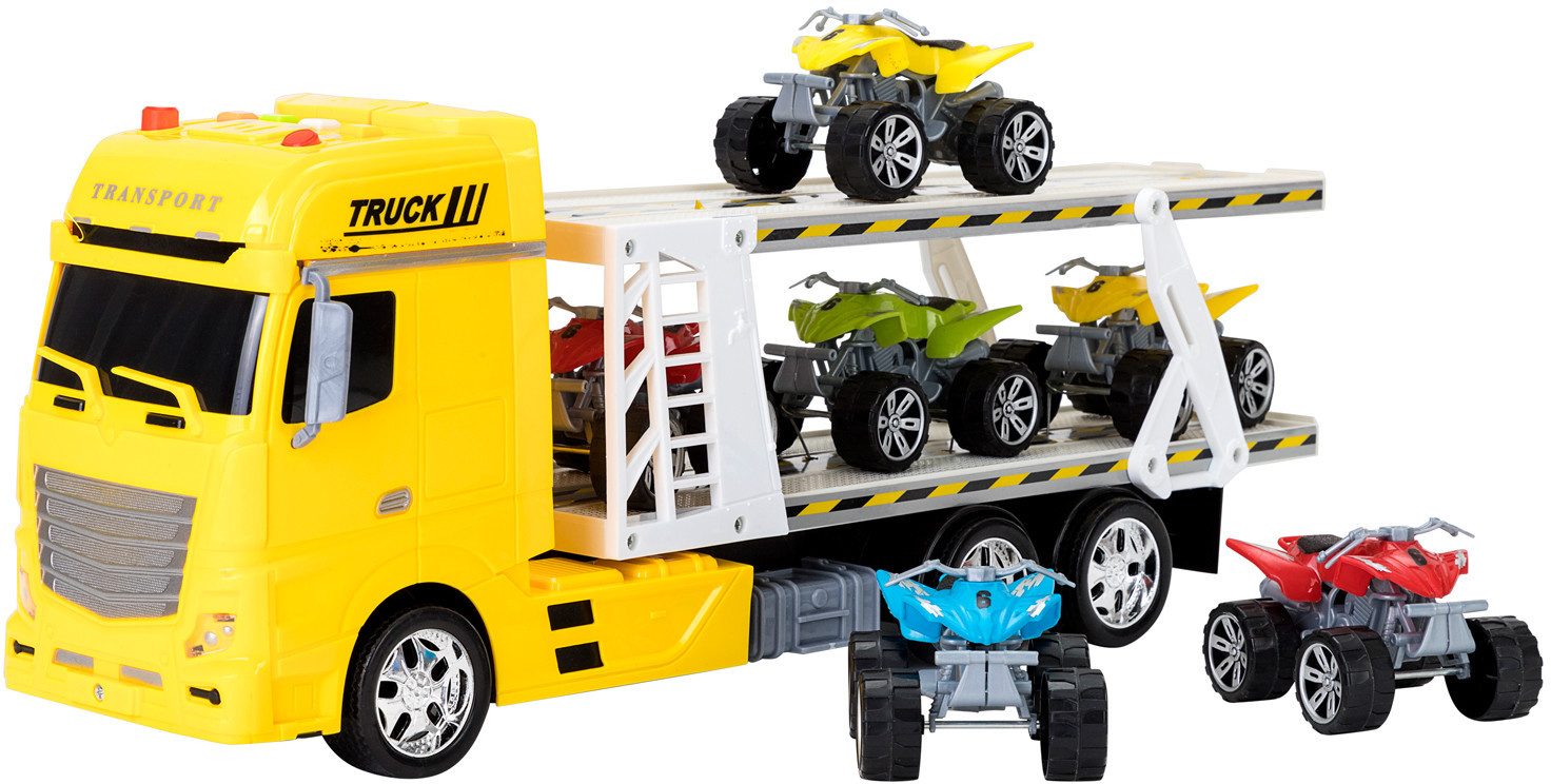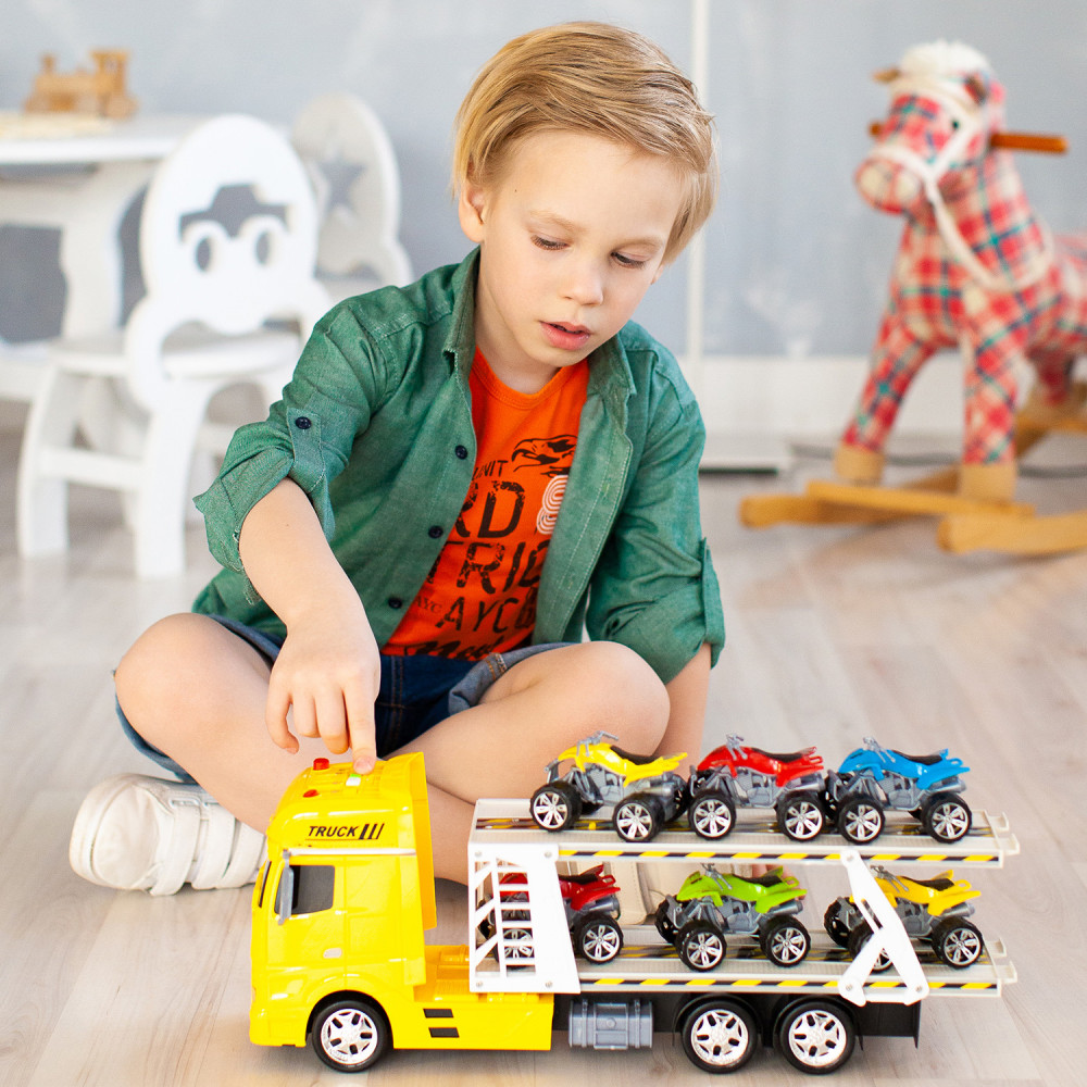 💳 Оплатить за товар можно при получении 🇰🇿 Есть бесплатная доставка по Казахстану от 1 дня 🎁 Копите бонусы с каждой покупки Серия: Мой город Автовоз «Givito» — игрушечный грузовой автомобиль со звуком и светом, с двухуровневым прицепом и с 6 квадроциклами. При нажатии на кнопки на кабине автовоза издаются звуки: работающего мотора, клаксона, сирены. Ребенок может переключаться между несколькими режимами и поучать другой звук. |