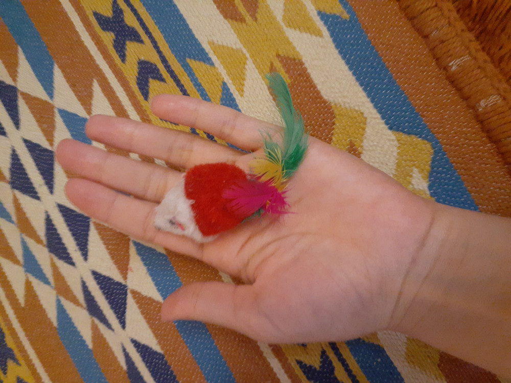 Даже без перышек (которые регулярно пришиваю обратно) котенок с ней носится, стала одной из любимых игрушек.