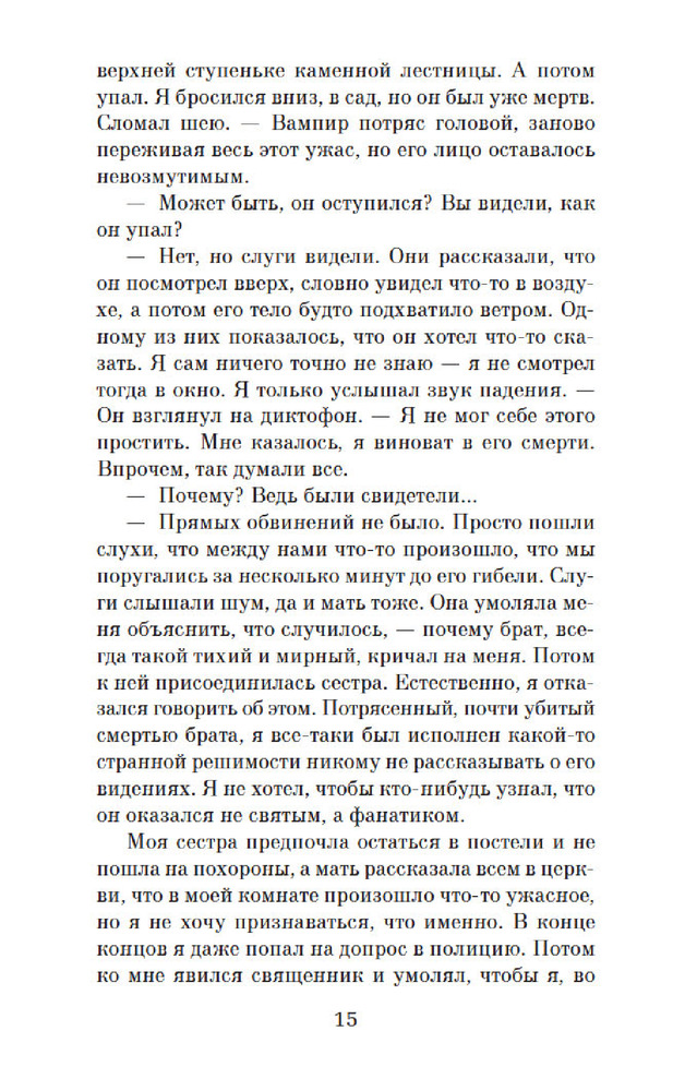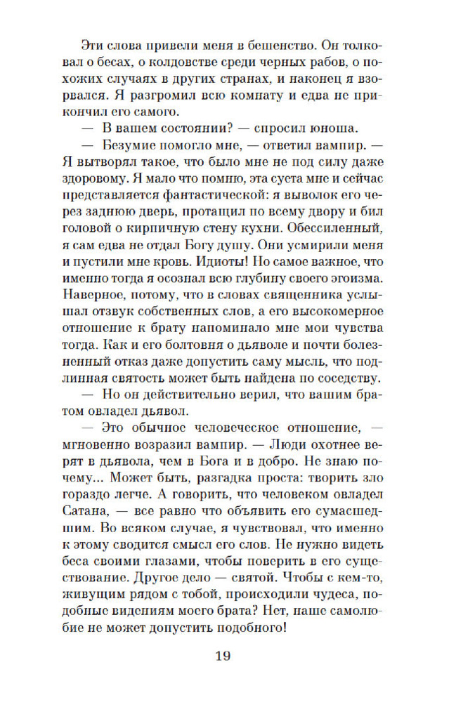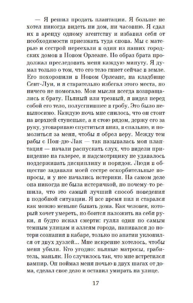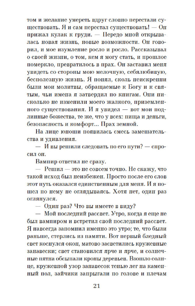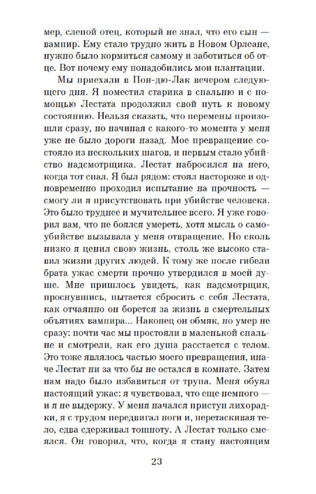 «Интервью с вампиром» Энн Райс — это захватывающая история о превратностях судьбы вампира Луи, рассказанная им самим молодому журналисту. Книга открывает целый мир вампиров, где герои ищут подобных себе существ и сталкиваются с разными видами вампиров. Повествование ведётся от первого лица, что позволяет читателю лучше понять мысли и чувства главного героя. Луи рассказывает о своём превращении в вампира и о том, как ему пришлось жить с этим новым существованием. Он испытывает сострадание к своим жертвам и пытается найти ответы на вопросы о смысле жизни и своём предназначении. Стиль написания книги сочетает в себе неторопливость и глубину, что позволяет читателю проникнуться проблемами и переживаниями героя. Описание природы и людей добавляет книге атмосферности и красоты. «Интервью с вампиром» — это не только история о вампирах, но и философский роман о поиске смысла жизни, преодолении страха и принятии себя таким, какой ты есть. Книга обязательна к прочтению всем любителям качественной литературы и тем, кто хочет узнать больше о мире вампиров.