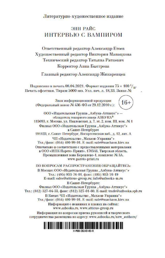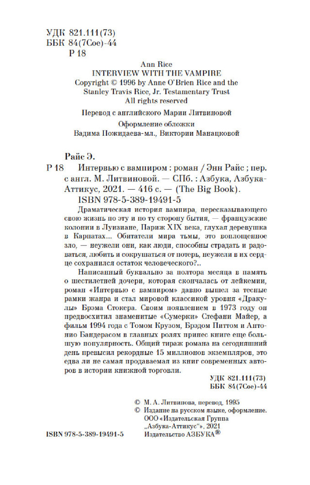 💳 Оплатить за товар можно при получении 🇰🇿 Есть бесплатная доставка по Казахстану от 1 дня 🎁 Копите бонусы с каждой покупки Серия: The Big Book Драматическая история вампира, пересказывающего свою жизнь по эту и по ту сторону бытия, — французские колонии в Луизиане, Париж XIX века, глухая деревушка в Карпатах... Обитатели мира тьмы, это воплощенное зло, — неужели они, как люди, способны страдать и радоваться, лю бить и сокрушаться от потерь, неужели в их сердце сохранился остаток еловеческого?.. |