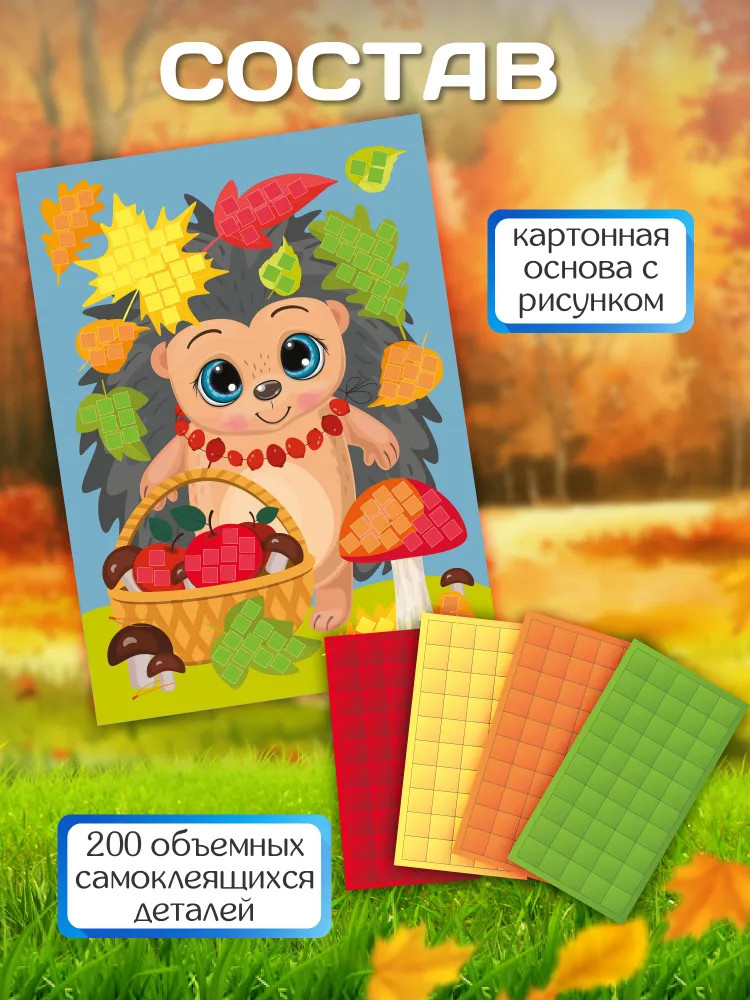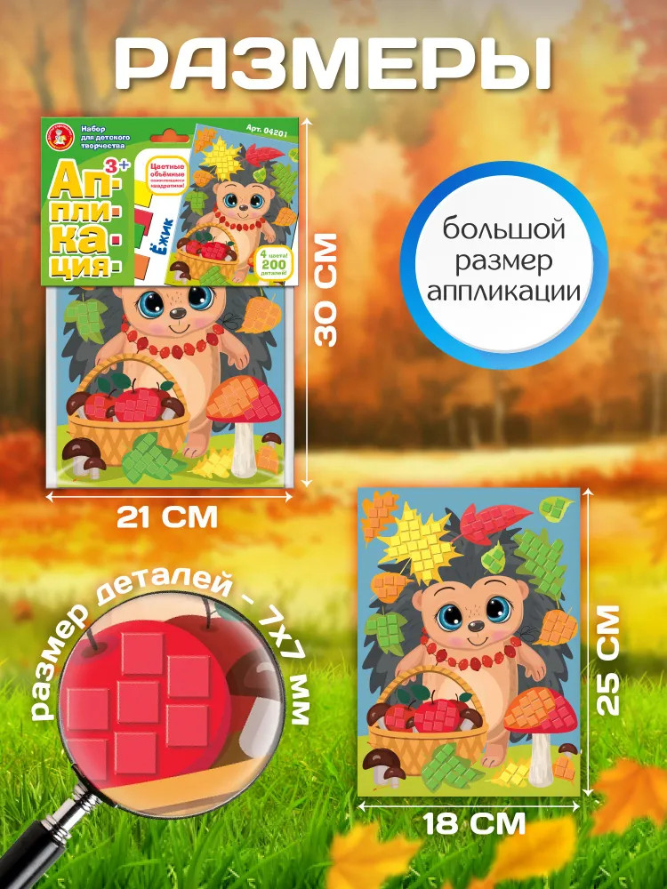 Десятое королевство Аппликация «Ёжик»яркая картинка красочный хорошие материалы В данный момент этот товар отсутствует в продаже. Возможно, у нас найдется аналогичный или похожий товар здесь. Аппликация — набор для творчества для детей от 3-х лет. Украшайте картинку самоклеящимися квадратиками, развивайте моторику пальчиков и стимулируйте творческие способности ребёнка. Подберите квадратик по цвету. Отделите самоклеящейся квадратик от блока. Приклейте квадратик на картонную основу, на соответствующее его цвету место. |