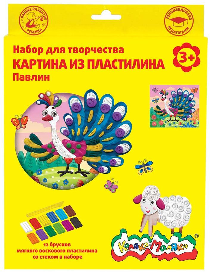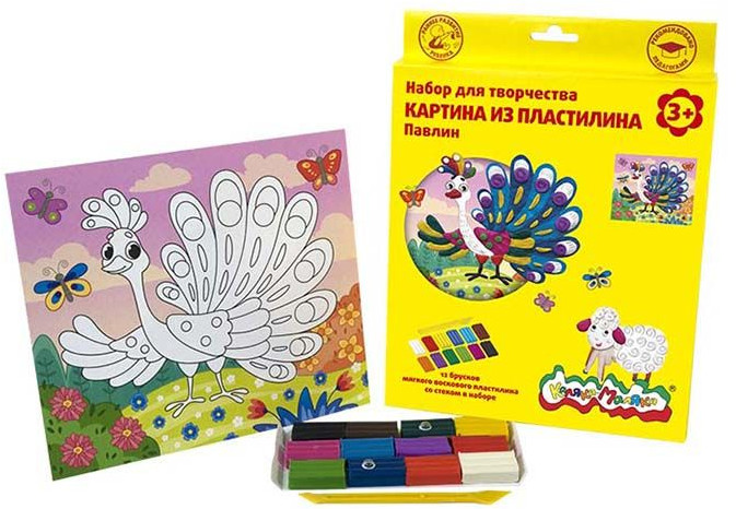 Картины из пластилина, с удобной подставкой и 12 брусками воскового пластилина — первый шаг для занятий ребенка пластилинографией. В набор входит красочная картинка с контурным рисунком под раскрашивание и ярким фоном. На некоторых участках рисунка необходимо создать фактуру, используя стек. Дополнительный элемент декора — веселые подвижные глазки. Картину из пластилина «Каляка-Маляка» можно поставить, согнув опорные ножки на оборотной стороне. Набор идеально подходит для первых аппликаций пластилином.