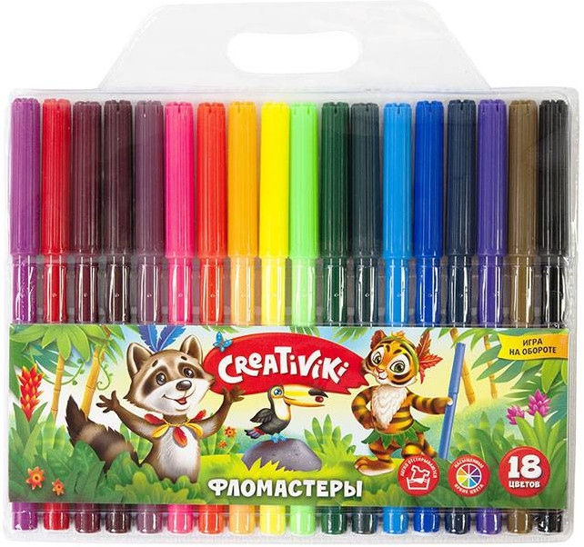 Creativiki ФломастерыВ данный момент этот товар отсутствует в продаже. Возможно, у нас найдется аналогичный или похожий товар здесь. Яркие и насыщенные фломастеры — 18 цветов. Маленькие креативики в процессе рисования раскрывают творческий потенциал, учатся аккуратности, усидчивости, а весёлая игра на обороте развивает внимательность. Изготовлены из хорошего пластика, оснащены вентилируемым колпачком, согласно нормам безопасности, и легко отстирываются с одежды. Диаметр корпуса — 8 мм, размер с колпачком — 133 мм. |