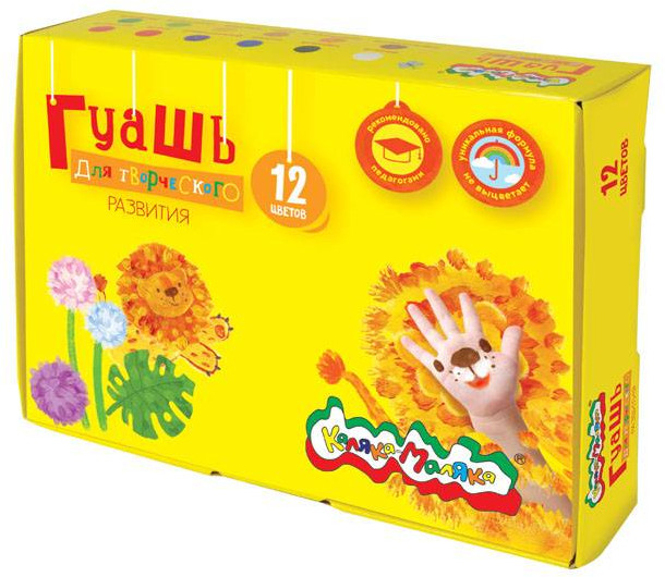 Гуашь Каляка-Маляка предназначена для детского творчества. Отлично подходит в качестве первого материала для обучения рисованию. Имеет оптимальное цветовое сочетание, обладает хорошей насыщенностью и чистотой тона. Отличается прекрасной кроющей способностью. При необходимости разбавляется водой.
