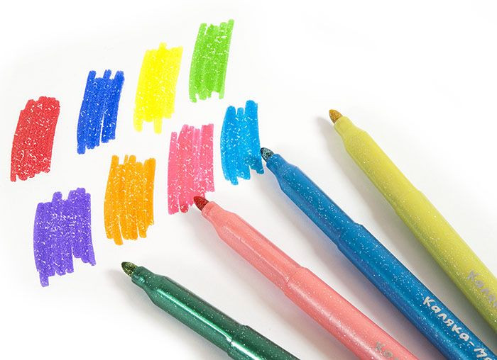 Фломастеры красоты неописуемой.Похожи на гелевые ручки.Блестят. Постороннего запаха нет.