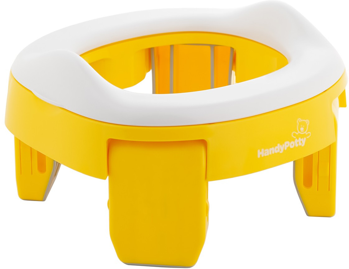 • дорожный горшок. Стоить заметить, что в новом «HandyPotty» мы увеличили высоту посадки, теперь это самый высокий дорожный горшок среди аналогов. В путешествии он используется со специальными одноразовыми пакетами, которые устанавливаются на место вкладки, а после использования просто утилизируются, как подгузники. Пакеты кладутся под сиденье, так что ребенок не испытывает никаких дискомфортных ощущений. Для удобства переноски ножки горшка складываются внутрь, так что приспособление занимает минимум места. Отличный горшок в дорогу;