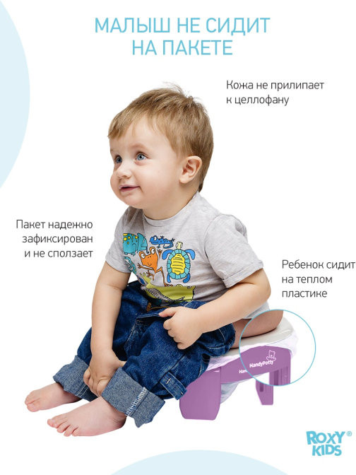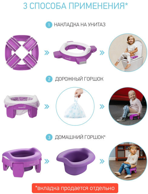 Прогулки и путешествия с ребенком станут намного комфортнее с дорожным горшком «HandyPotty». Это простое приспособление сочетает в себе функции трех аксессуаров: обычного горшка, дорожного горшка и адаптера для унитаза, что позволяет использовать «HandyPotty» длительное время.