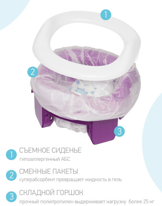 В комплекте: комфортное сиденье — накладка, защита от разбрызгивания, удобная сумка на молнии, 3 одноразовых пакета.
