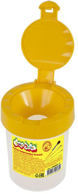Яркая солнечно-желтая крышка и информативная этикетка обязательно привлекут внимание на полке. Подходит для крупных кистей. Идеален для сохранения рабочего метса ребенка в чистоте. Имеет 5 удобных желобков для кистей. Сделан из сертифицированного безопасного полипропилена. Яркий дизайн мотивирует заниматься творчеством!