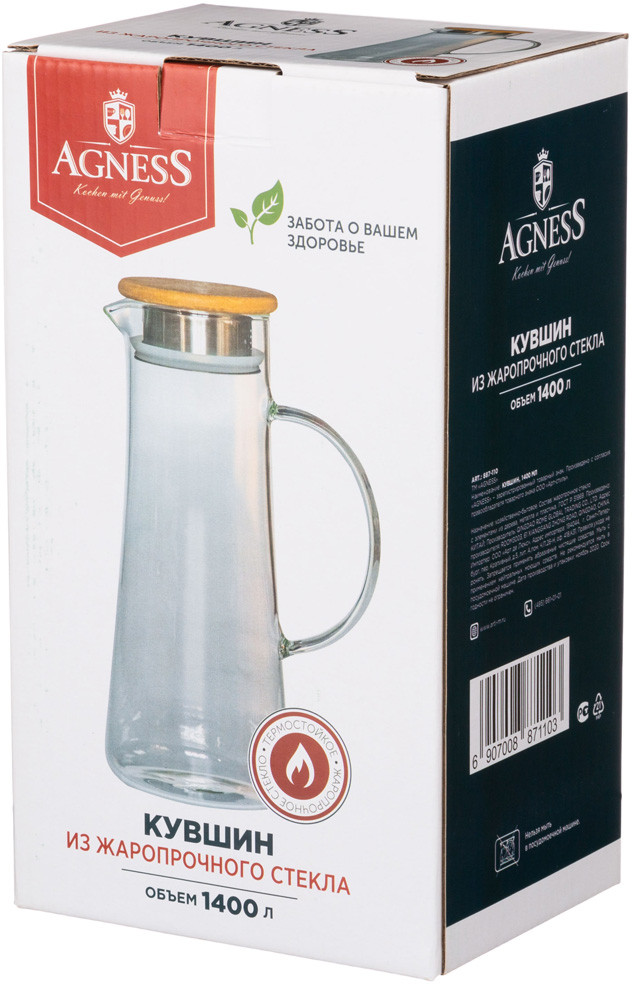 Agness КувшинВ данный момент этот товар отсутствует в продаже. Возможно, у нас найдется аналогичный или похожий товар здесь. Серия: Native Стеклянный кувшин выполнен из термостойкого жаропрочного стекла, которое выдерживает высокую температуру кипящей воды. Кувшин предназначен для подачи на стол сока, морса и других, не только холодных, но и горячих напитков. Кувшин оснащен удобной ручкой и плотно закрывающейся крышкой. Крышка снабжена силиконовым уплотнителем, благодаря которому она надежно удерживается на корпусе. Носик кувшина выполнен по технологии анти-капля, таким образом, наливая жидкость в стакан, Вы не прольете ни капли. |