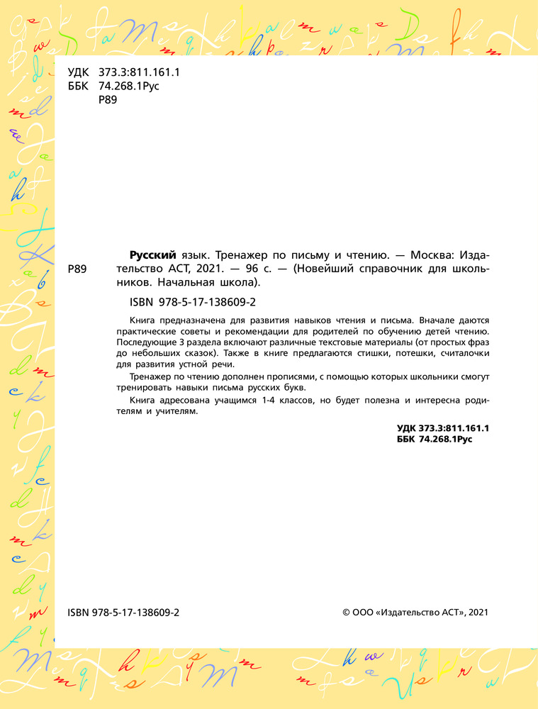 Русский язык. Тренажер по письму и чтениюВ данный момент этот товар отсутствует в продаже. Возможно, у нас найдется аналогичный или похожий товар здесь. Серия: Новейший справочник для школьников. Начальная школа Книга предназначена для развития навыков чтения и письма. Вначале даются практические советы и рекомендации для родителей по обучению детей чтению. Последующие 3 раздела включают различные текстовые материалы (от простых фраз до небольших сказок). Также в книге предлагаются стишки, потешки, считалочки для развития устной речи. |