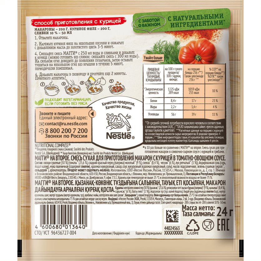 Maggi Приправа для макарон с курицей в томатно-овощном соусеВ данный момент этот товар отсутствует в продаже. Возможно, у нас найдется аналогичный или похожий товар здесь. Серия: На Второе Магги Больше Овощей — это продукты для макарон и супов, приготовленные из натуральных овощей летнего урожая, душистой зелени и ароматных специй. Каждая упаковка содержит 5 различных овощей, которых в составе 50%, а весь процесс готовки занимает не более 20 минут. |