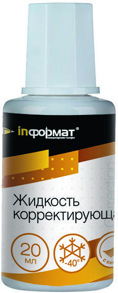 Informat Жидкость корректирующая с кисточкойВ данный момент этот товар отсутствует в продаже. Возможно, у нас найдется аналогичный или похожий товар здесь. Морозоустойчивая жидкость с кисточкой. Cохраняет свои свойства при t −40°C. Состав жидкости позволяет чисто и быстро корректировать любые виды документов. Обладает высокой степенью покрытия, быстросохнущая, для всех видов бумаг. Объём — 20 мл. |