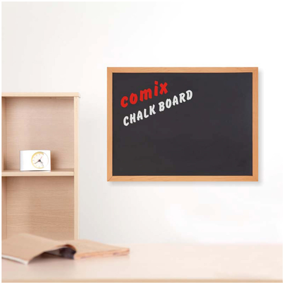 Доска неплохая. Рабочая (черная) поверхность очень гладкая. Рамка обклеена пленкой под дерево. По утверждению производителя (на этикетке) внутри - тоже дерево. С лицевой и изнаночной стороны эта пленка смотрится аккуратно, но на внешних сторонах углов стыки разочаровывают. И лучше не пробуйте отклеить стикер "Comix" - повредите пленку, она очень тонкая. Соответственно, производитель "ограничил" использование доски только горизонтальным положением. Ну, или придумайте чем закрыть стикер.