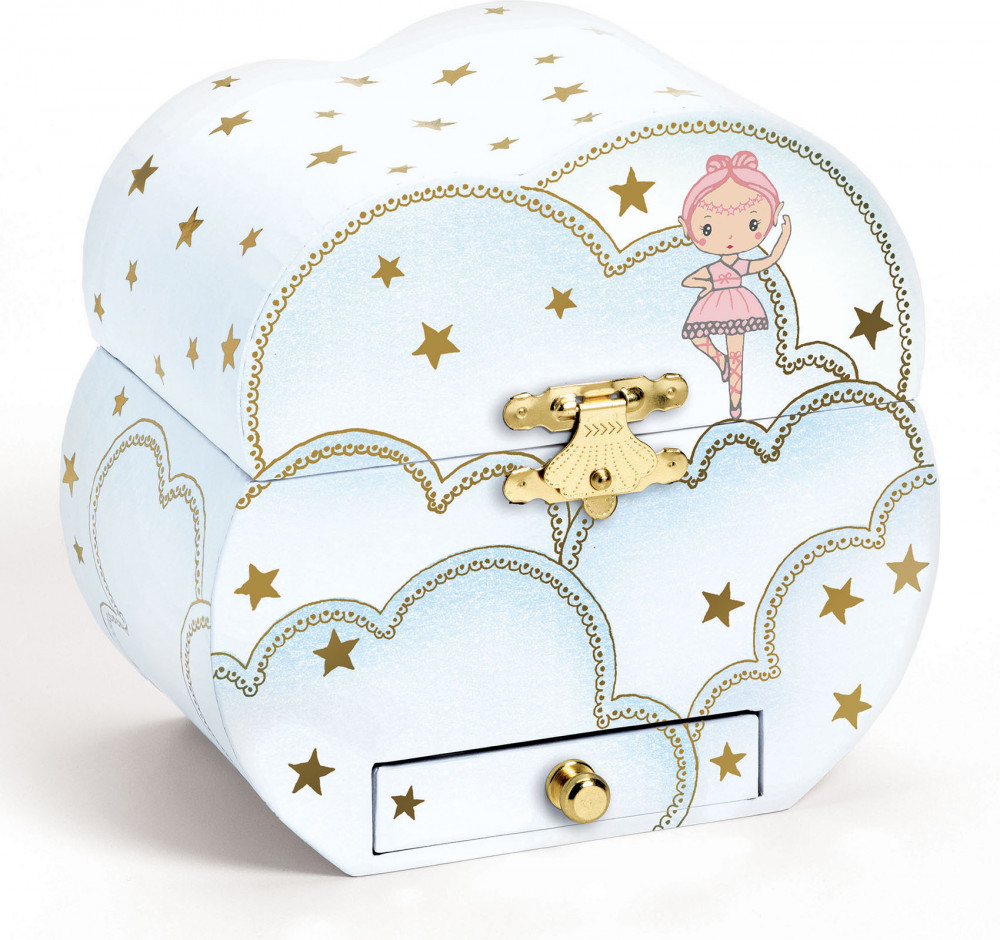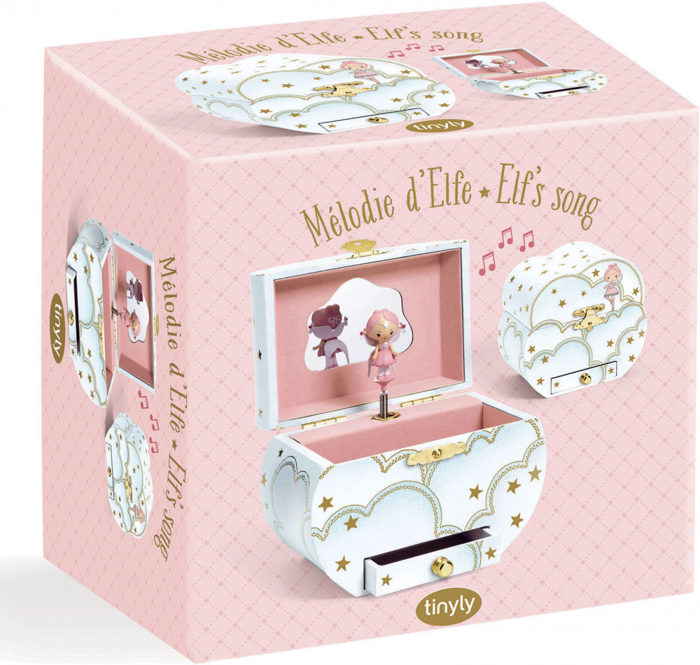Djeco Шкатулка музыкальная «Песня Эльфа»В данный момент этот товар отсутствует в продаже. Возможно, у нас найдется аналогичный или похожий товар здесь. «Песня Эльфа» от французского производителя «Djeco» — это красиво иллюстрированная музыкальная шкатулка в виде сказочного облака, в которой хранятся украшения и секреты маленькой принцессы. Эта музыкальная шкатулка входит в коллекцию персонажей и аксессуаров Tinyly — волшебный мир, созданный компанией «Djeco» совместно с известным дизайнером Вирджини Брашэ. Поверните ручку, откройте коробку — вы увидите изящную танцовщицу и услышите мелодию «Приглашение к танцу» Карла Марии фон Вебера. Внутренняя отделка шкатулки выполнена из мягкого бархата, который приятен на ощупь. Под крышкой коробочки прикреплено зеркало с иллюстрированной рамкой вокруг. Мелодия длится примерно 2,5 минуты. Шкатулка от «Djeco» станет красивым украшением для детской комнаты и идеальным подарком на рождение ребёнка. |
