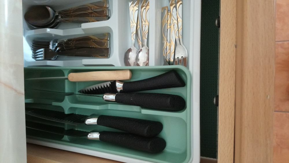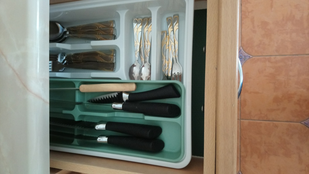 Очень удобный. В нижнем лотке ложки, вилки, а в верхнем - ножи. Размер подходит в выдвижной кухонный ящик