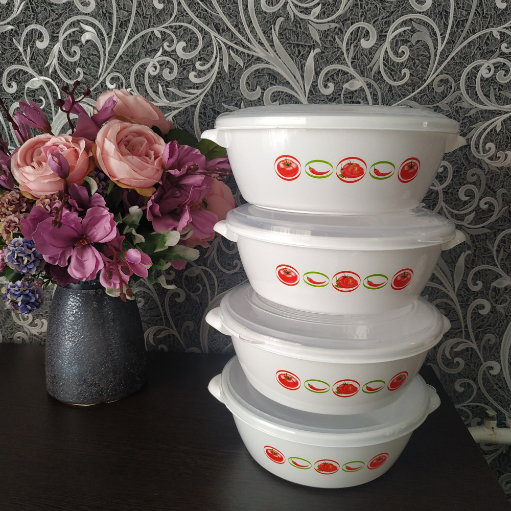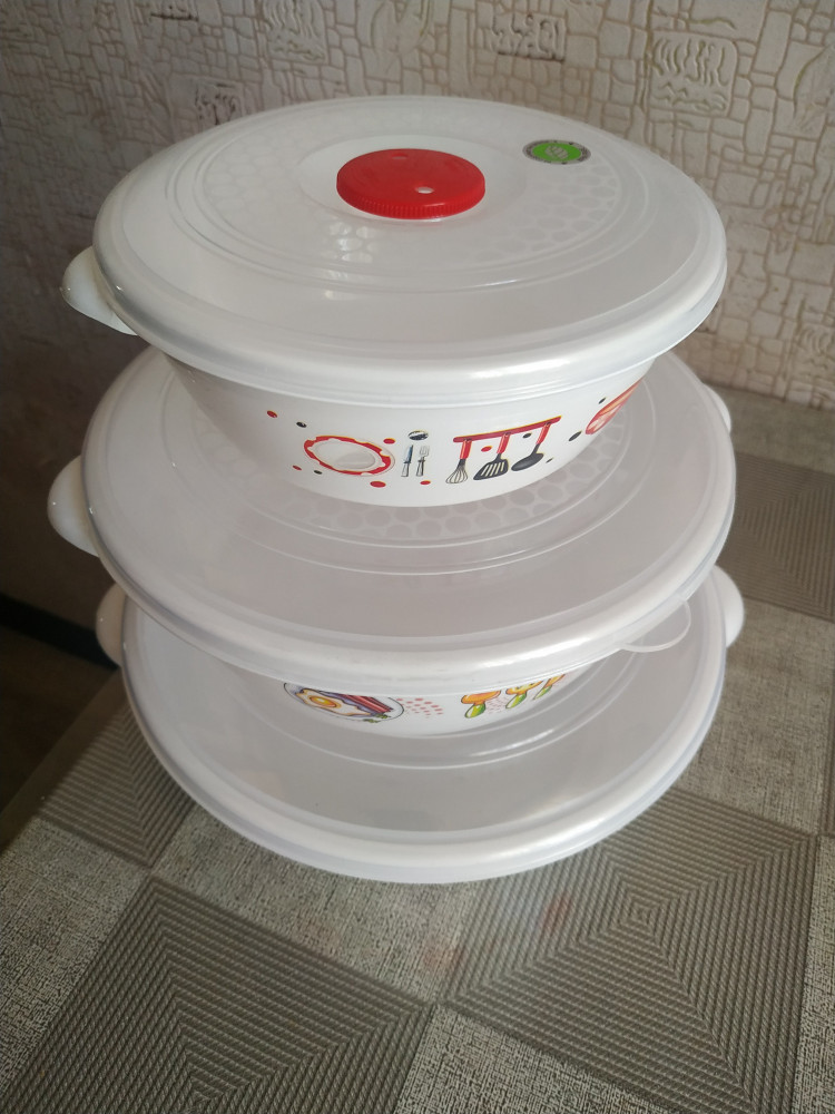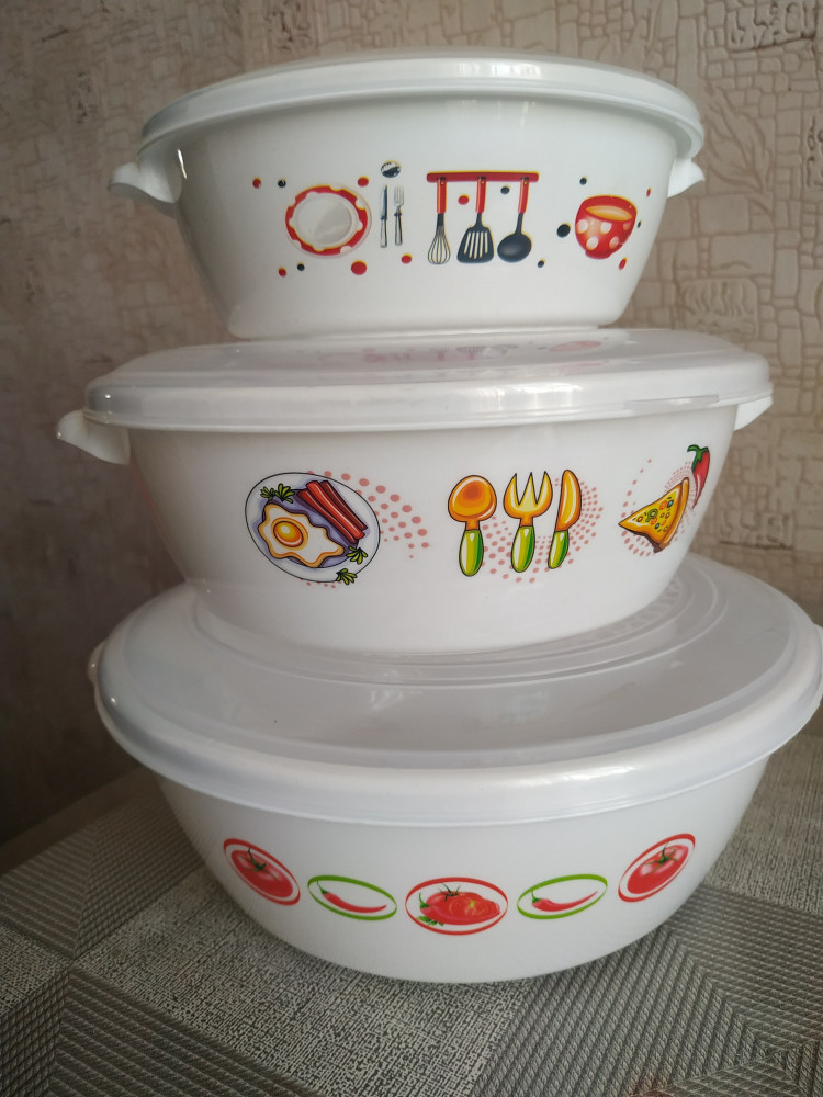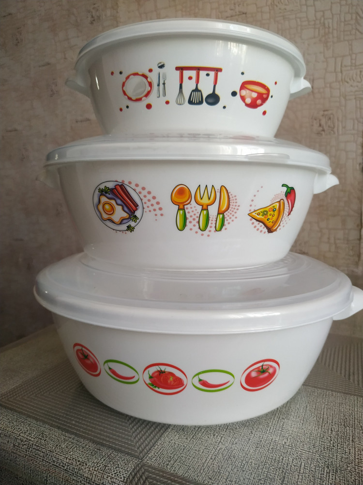 Брала для холодильника 4 штуки по 3 литра и 2 штуки по 2 литра,перекладывать с кастрюль готовую пишу. Крышка прозрачная хорошо видно,что лежит. Рисунок не наклейка,печать. Мне прислали такой,без возможности выбора. все устраивает и салат намешать и пишу подогреть и в холодильник убрать и в морозильник...универсальны. Рекомендую. Спасибо Флип