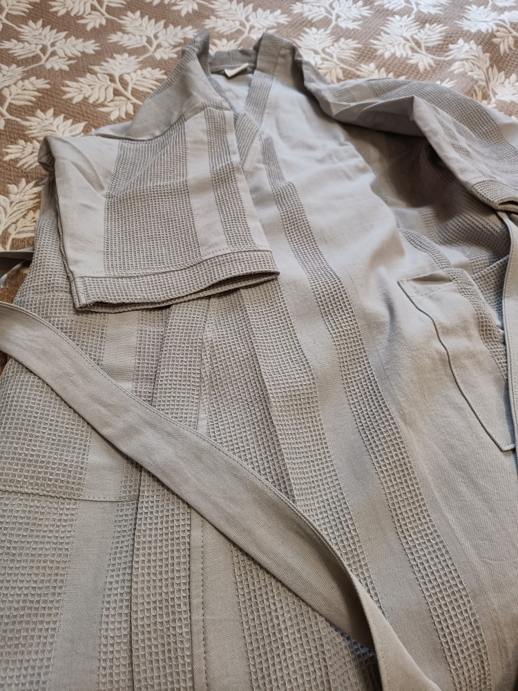 Хотя производитель пишет, что материал обработан антиусадочным компонентом, после стирки 40 градусов халат очень сильно подсел, на размер как минимум. Поэтому, конечно, впечатления стрёмные.
