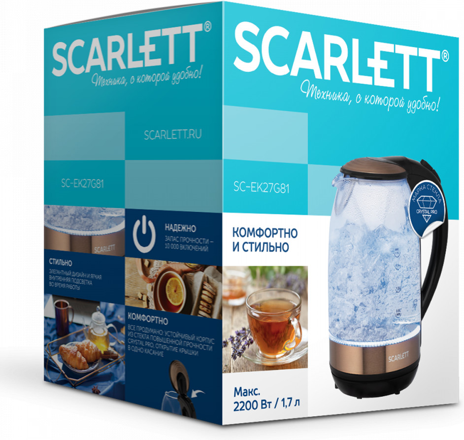 Scarlett Чайник электрический SC-EK27G81В данный момент этот товар отсутствует в продаже. Возможно, у нас найдется аналогичный или похожий товар здесь. Электрический чайник SC-EK27G81 объемом 1.7 л оснащён автоматической системой открытия крышки. Эргономичная ручка, закрытый нагревательный элемент сделают эксплуатацию прибора еще проще и комфортнее. Нейлоновый фильтр предотвратит попадание накипи в напиток. Трендовый, бронзовый цвет металлических элементов позволит прибору вписаться в интерьер кухни. |