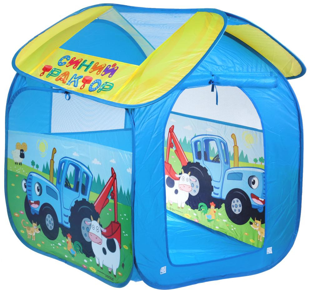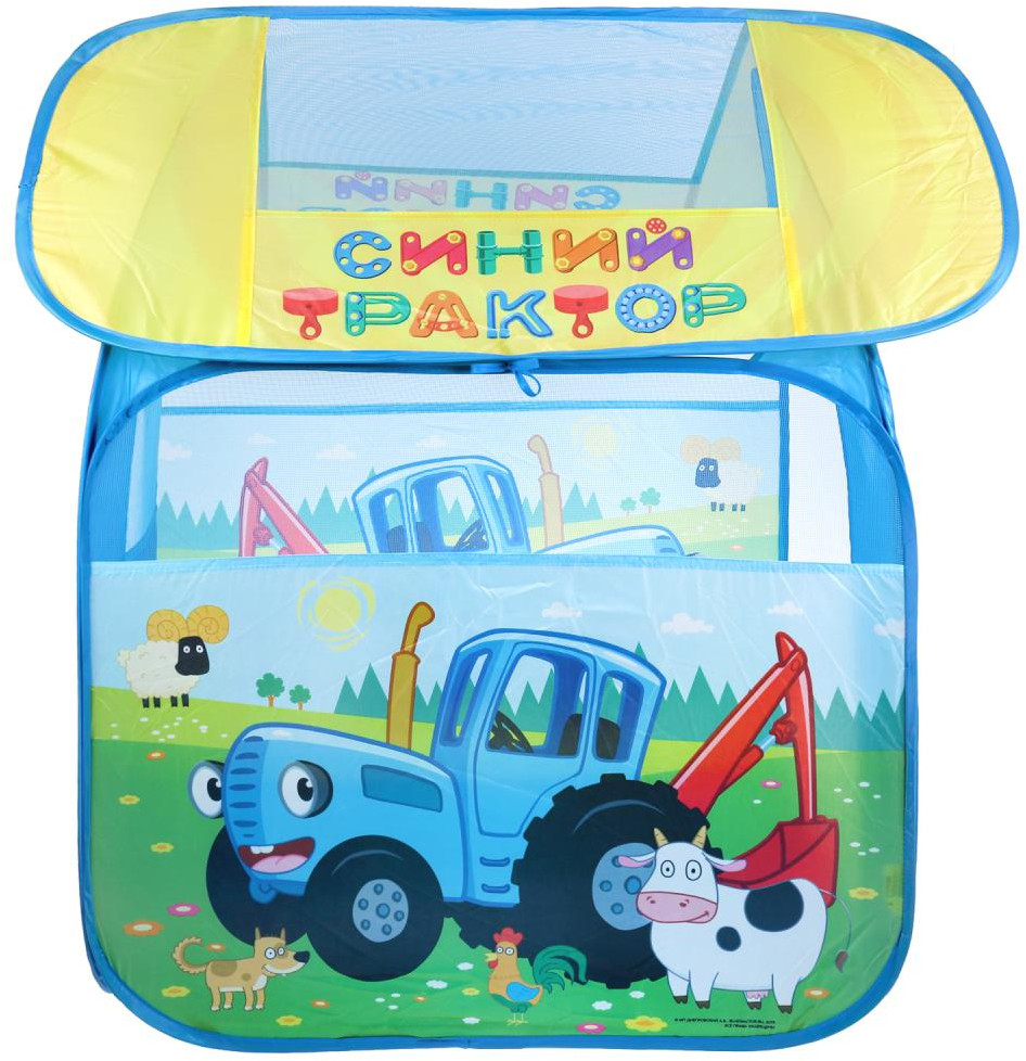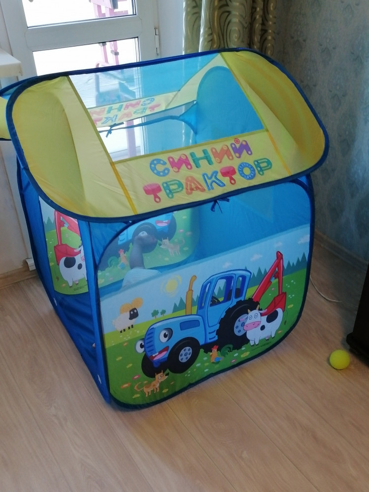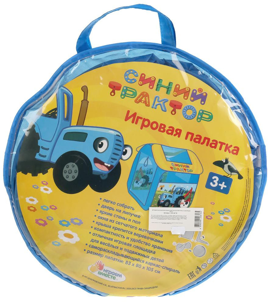 Детская игровая палатка «Синий трактор» с изображениями любимых персонажей мультфильма, с удобной застёжкой спереди: легко открывать и закрывать. Лёгкая и компактная, складывается в тканевую сумку: можно поставить дома в детской, взять с собой на природу и играть на свежем воздухе. Материал легко мыть и чистить
