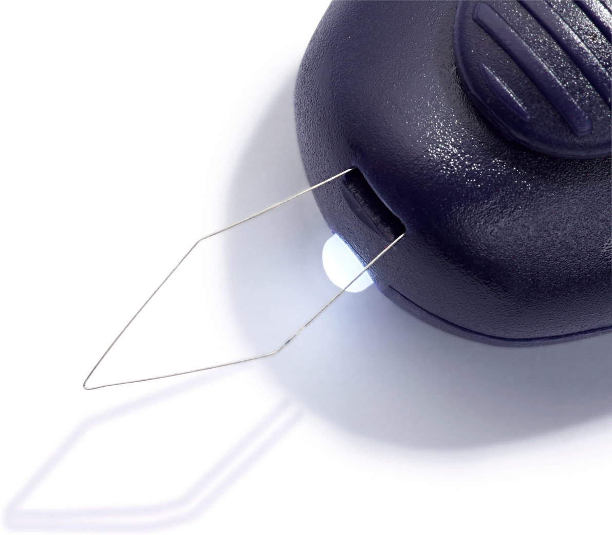 Небольшой, удобный, сбоку встроен обрезатель для нити, подсветка яркая.