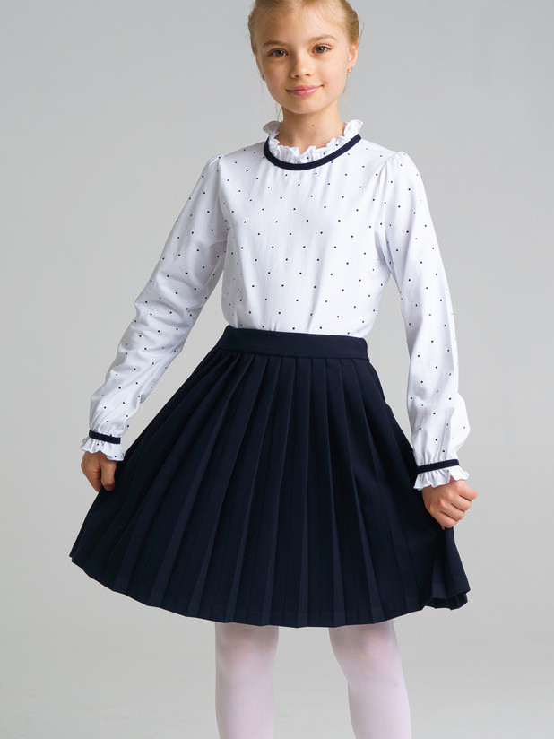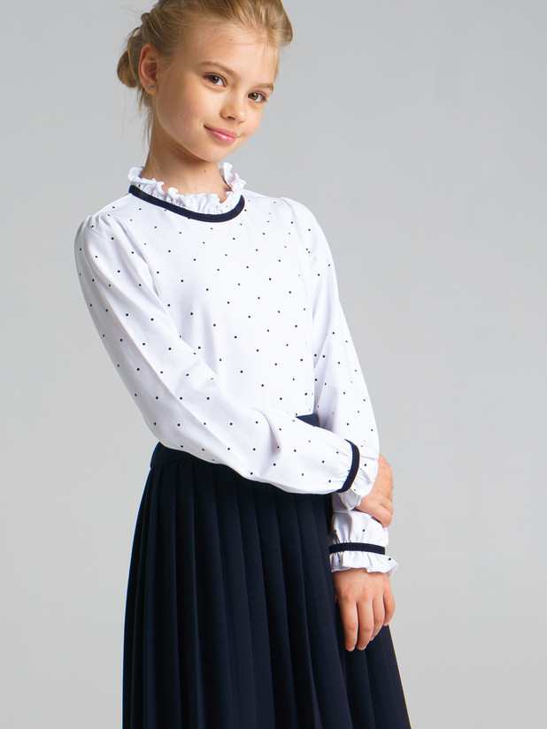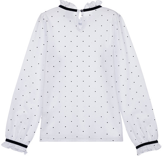 Блузка трикотажная с высоким содержанием хлопка. Благодаря наличию эластана в составе ткани, изделие проще в уходе и держит форму. Полуприлегающий силуэт, по низу рукавов и горловине рюша, застежка на пуговицу на спинке.