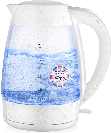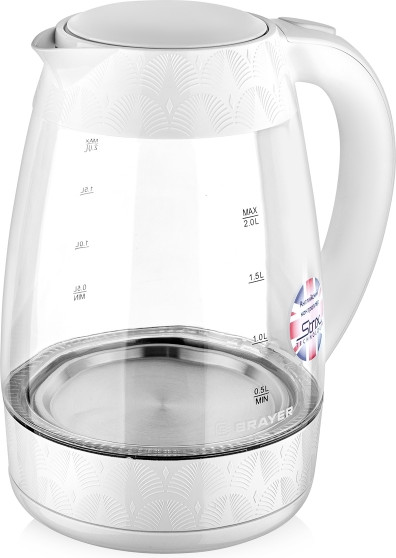 Brayer BR1024 — красивый электрочайник, оформленный в необычном стиле. Его корпус изготовлен из высокопрочного термостойкого стекла. Быстрое кипячение обеспечивается нагревательным элементом мощностью 2200 Вт. Устройство отключается в автоматическом режиме при закипании или снятии с подставки, и не будет работать при пустом резервуаре.