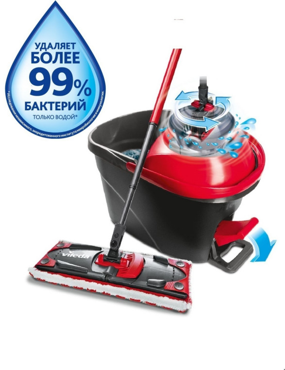 В данный момент этот товар отсутствует в продаже. Возможно, у нас найдется аналогичный или похожий товар здесь. Удовольствие от уборки дома? Возможно! С набором Vileda Ультрамат Турбо, который отжимает швабру за вас, мытье полов перестает быть утомительным. Регулируйте степень отжима швабры, нажимая на педаль ведра; далее легкими движениями, «рисуя» на полу восьмерки, собирайте насадкой швабры все загрязнения. После уборки, легко слейте использованную воду через носик слива ведра, удерживая ведро за дополнительную ручку в его корпусе. Если у вас есть дети-подростки, прочтите им данную инструкцию и увидите, что уборка — игра, это тоже возможно! Набор для уборки Ультрамат Турбо состоит из швабры с телескопической ручкой и ведра с педальным отжимом.