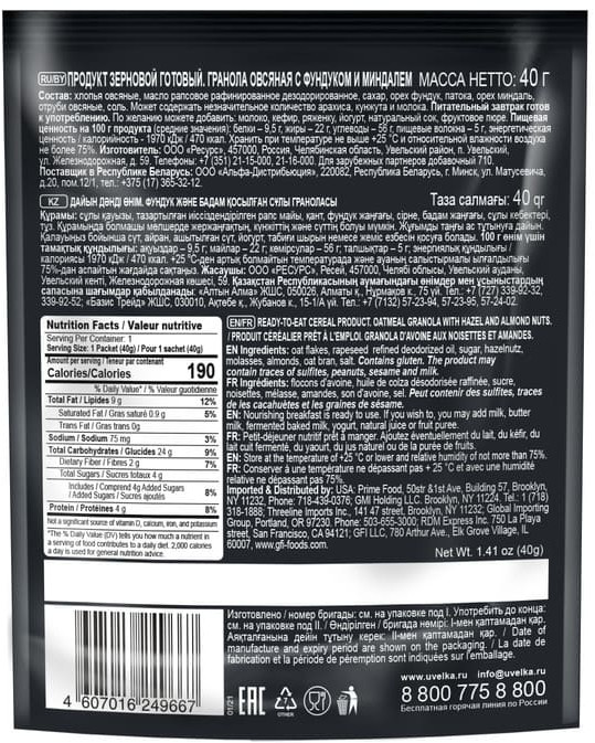 Вкусная гранола, пакетик как раз на 1 прием. Ем обычно с кефиром