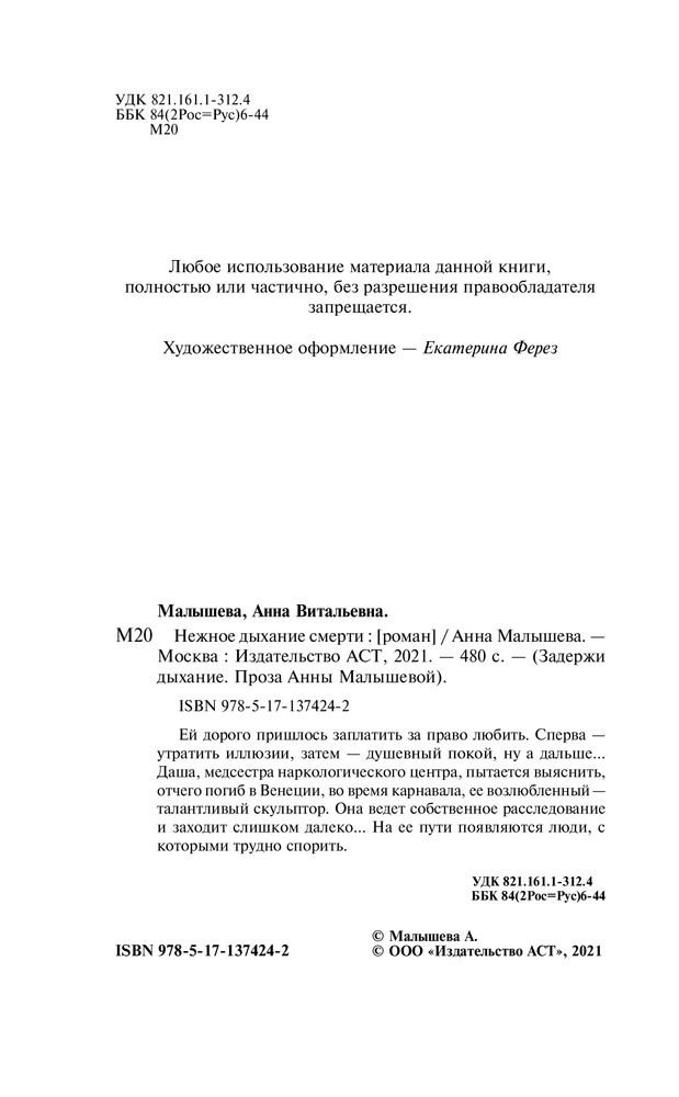💳 Оплатить за товар можно при получении 🇰🇿 Есть бесплатная доставка по Казахстану от 1 дня 🎁 Копите бонусы с каждой покупки Серия: Задержи дыхание. Проза Анны Малышевой Ей дорого пришлось заплатить за право любить. Сперва — утратить иллюзии, затем — душевный покой, ну а дальше... Даша, медсестра наркологического центра, пытается выяснить, отчего погиб в Венеции, во время карнавала, ее возлюбленный — талантливый скульптор. Она ведет собственное расследование и заходит слишком далеко... На ее пути появляются люди, с которыми трудно спорить. |