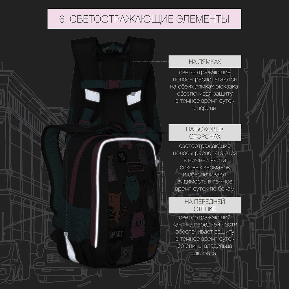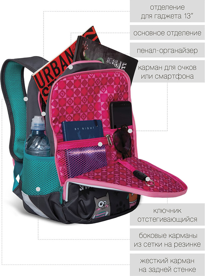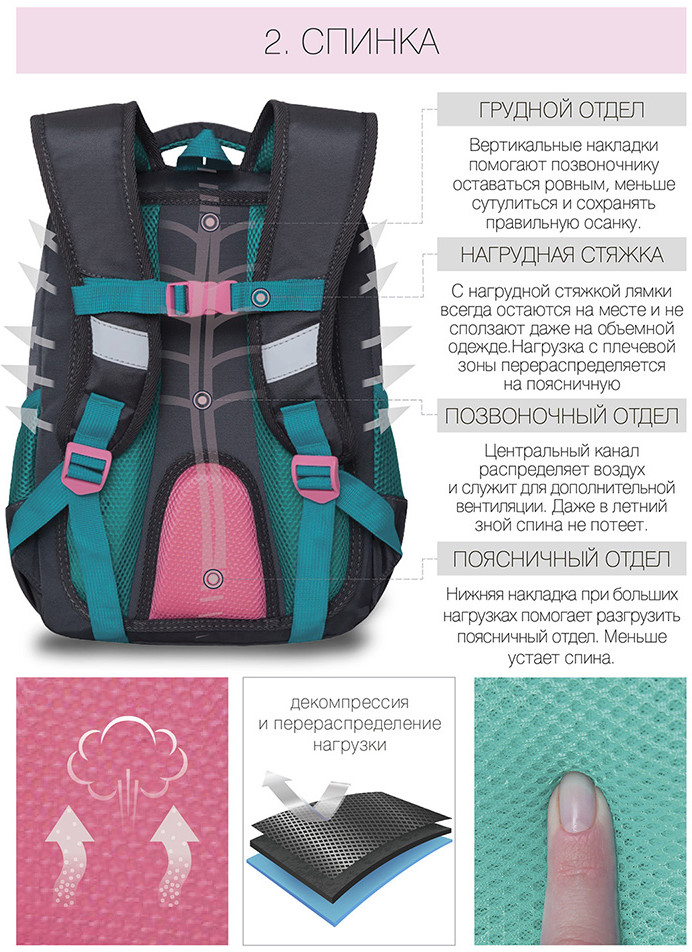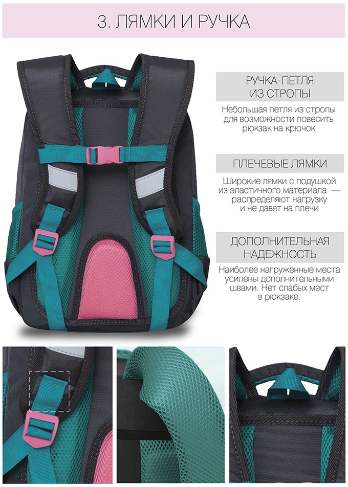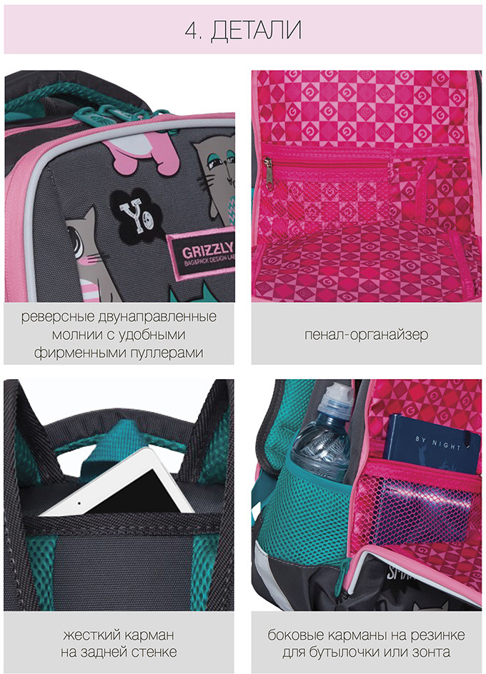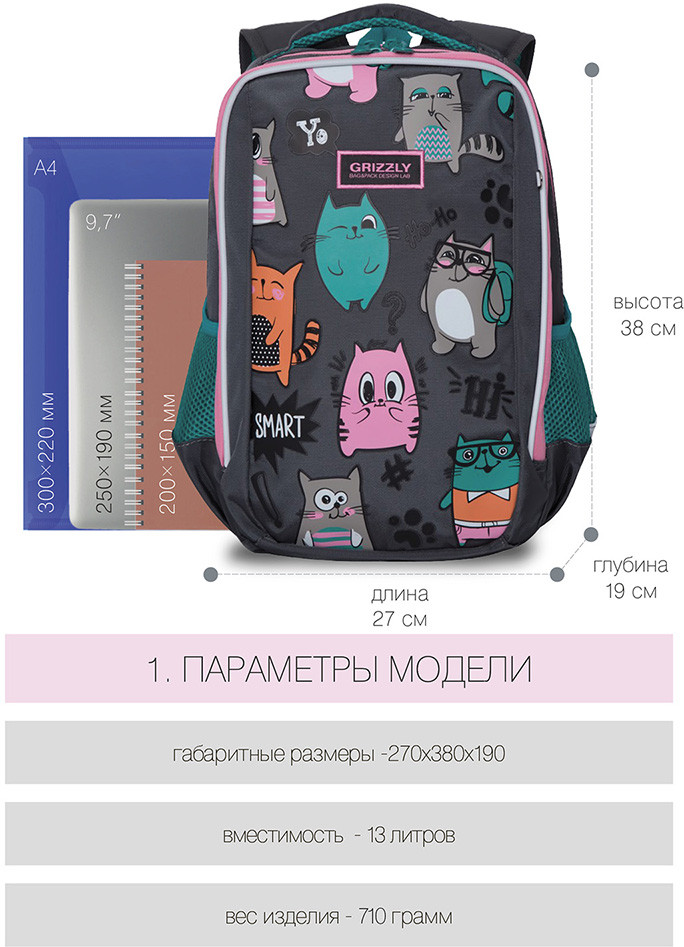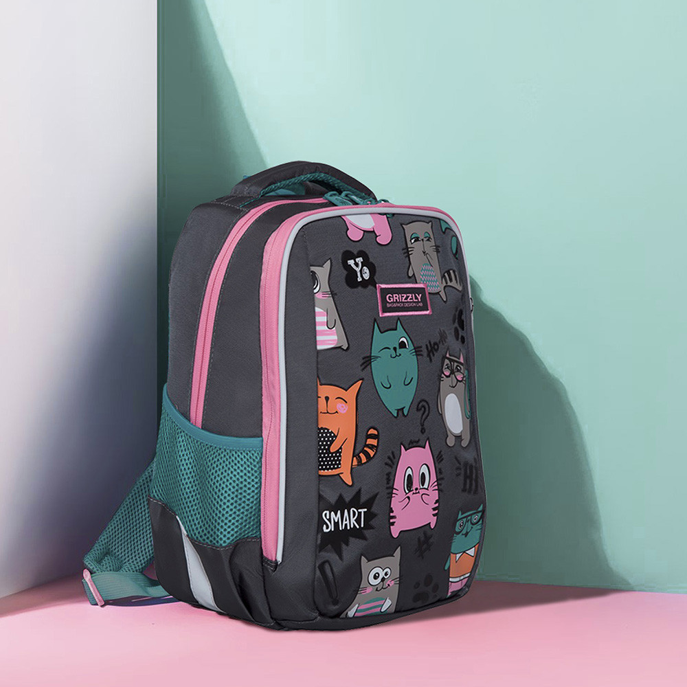 Замечательный рюкзак! Доча в восторге, первый класс. Все очень качественно, гризли топовая фирма в России, ни разу не пожалела что заказала его. Спинка и лямки удобны, разгружают спину ребенку. Очень даже вместительный. Ништячков много, кармашков, верёвочек для ключей