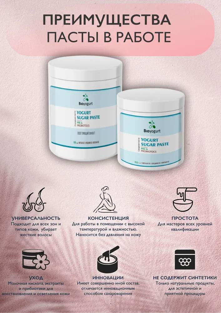 Йогуртовая паста является термостатным йогуртом, который не проходит стадию варки, а получается путем постоянного помешивания жидкости в теплой среде, в течении нескольких часов. Такой процесс обуславливается сохранением прибиотиков и других полезных свойств пасты. Цвета в пастах — это натуральный пищевой краситель, который используется на пищевом производстве. Не содержит в себе синтетики, только натуральные продукты, которые используются для того, чтобы сделать процедуру эпиляции более эстетичной и приятной, как для мастера, так и для клиента, а также уйти от стандартов.