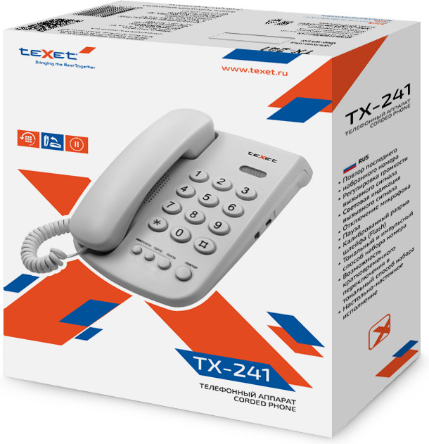 Проводной телефон ТХ-241 — это базовая модель линейки teXet с оптимальным набором функций. Модель представлена в светло-сером и черном цвете и будет уместна для использования и дома, и в офисе.