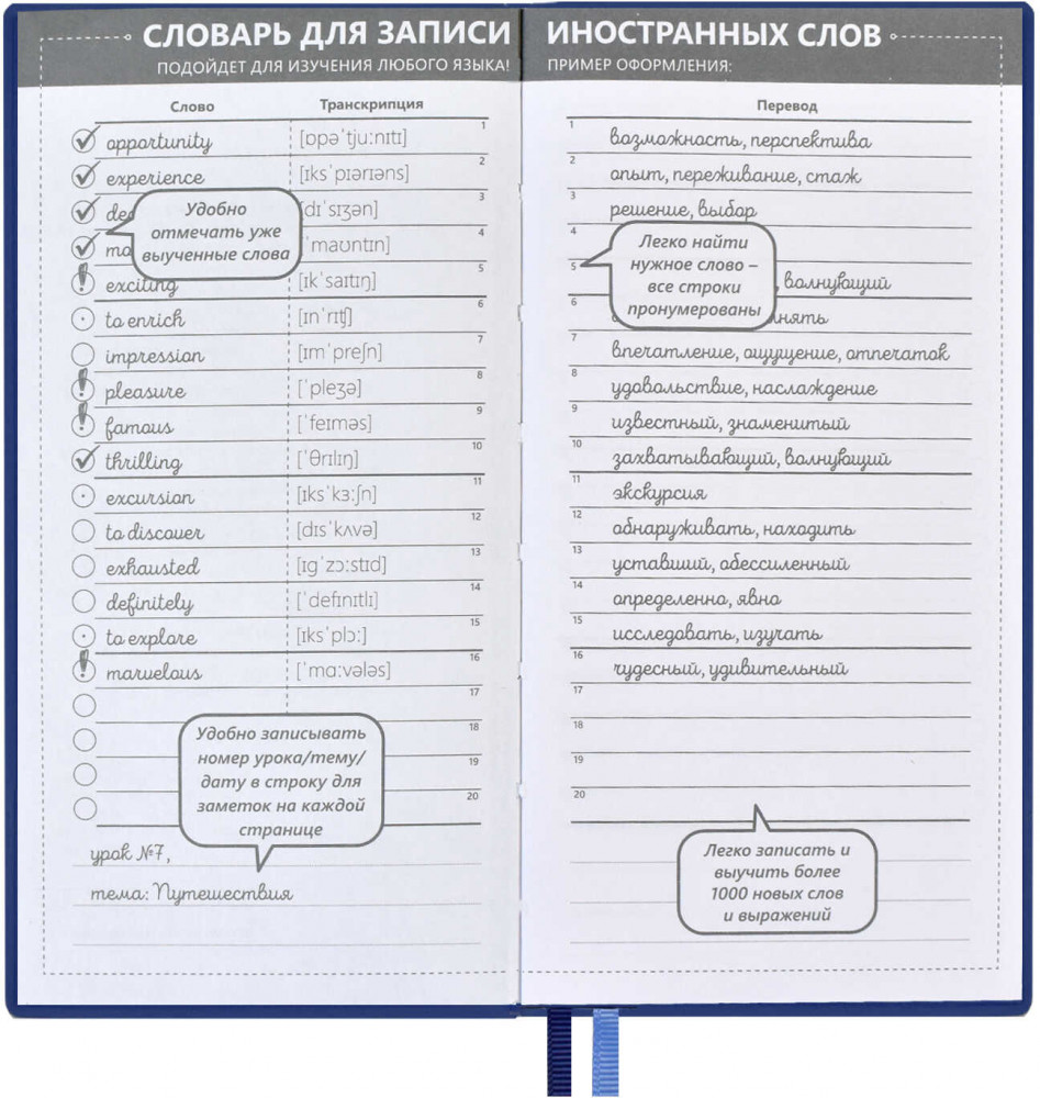 Тетрадь для записи иностранных слов послужит школьнику хорошим подспорьем для запоминания новых слов и выражений, которые были выучены на уроке. Школьник самостоятельно составляет мини-словарик, в котором всегда может быстро найти нужное ему слово, его перевод, написание и произношение.
