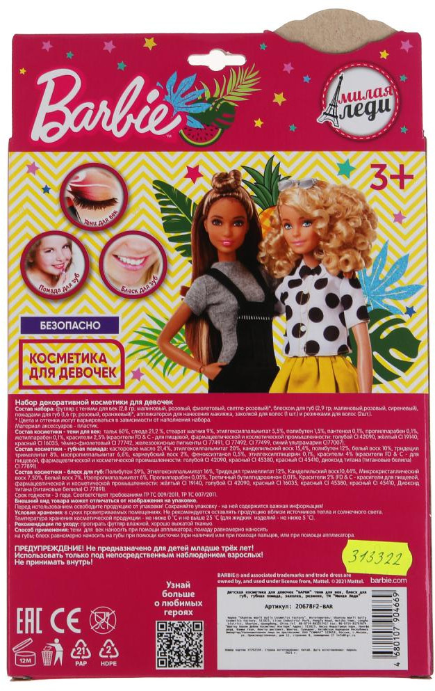 Милая Леди Набор косметики для девочекВ данный момент этот товар отсутствует в продаже. Возможно, у нас найдется аналогичный или похожий товар здесь. Набор косметики для девочек «Barbie» ТМ «Милая леди» непременно понравится маленькой моднице: |